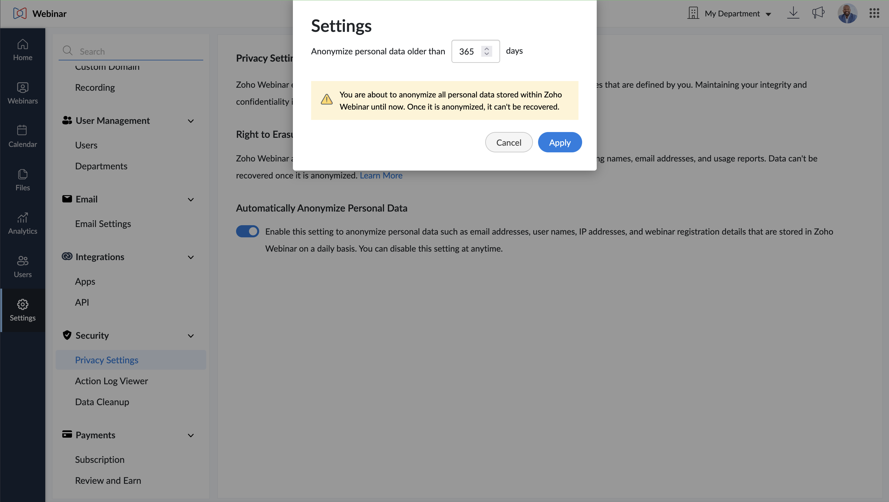 Configure your privacy settings to manage the data that is collected and stored in Zoho Webinar.