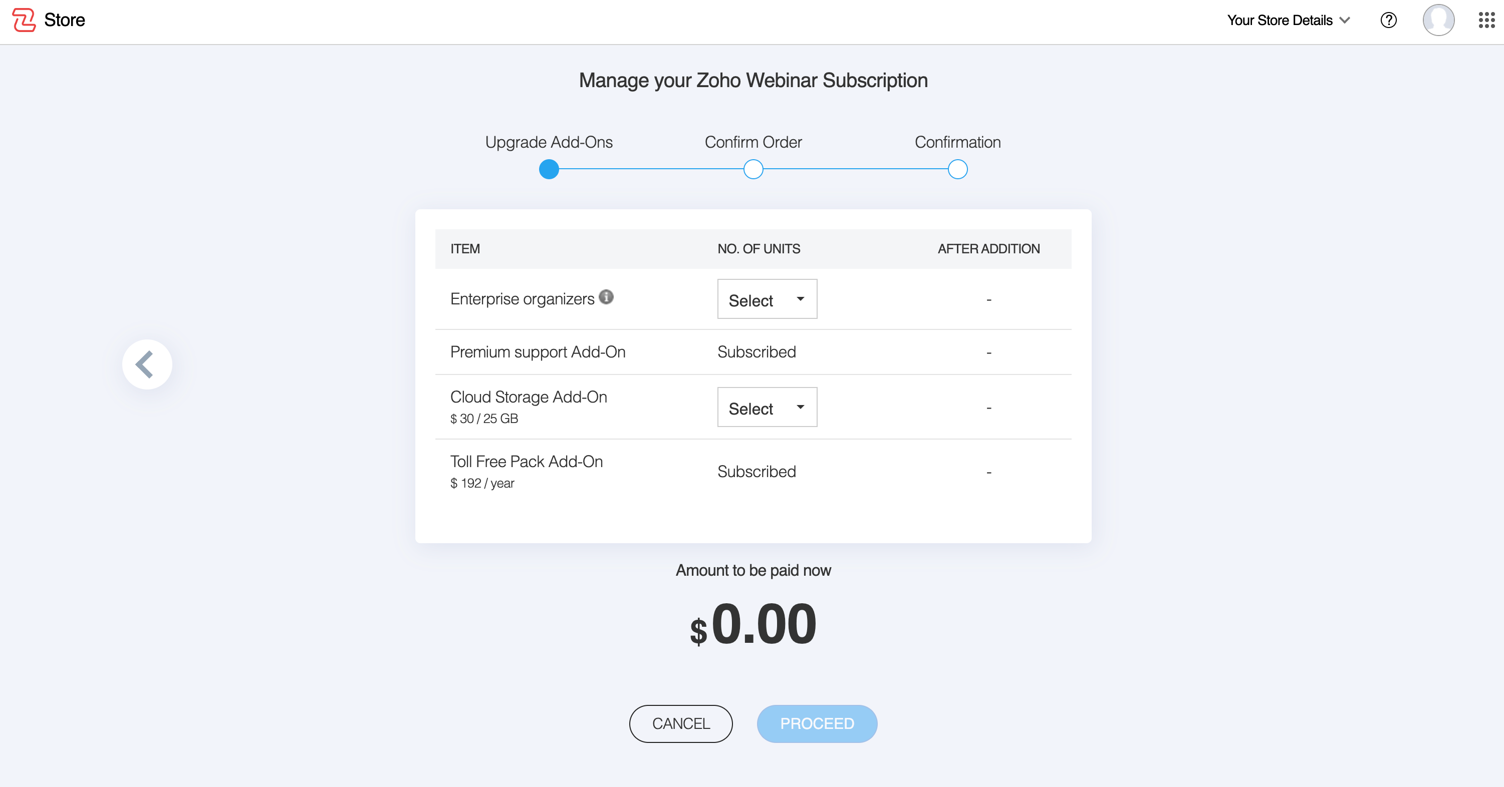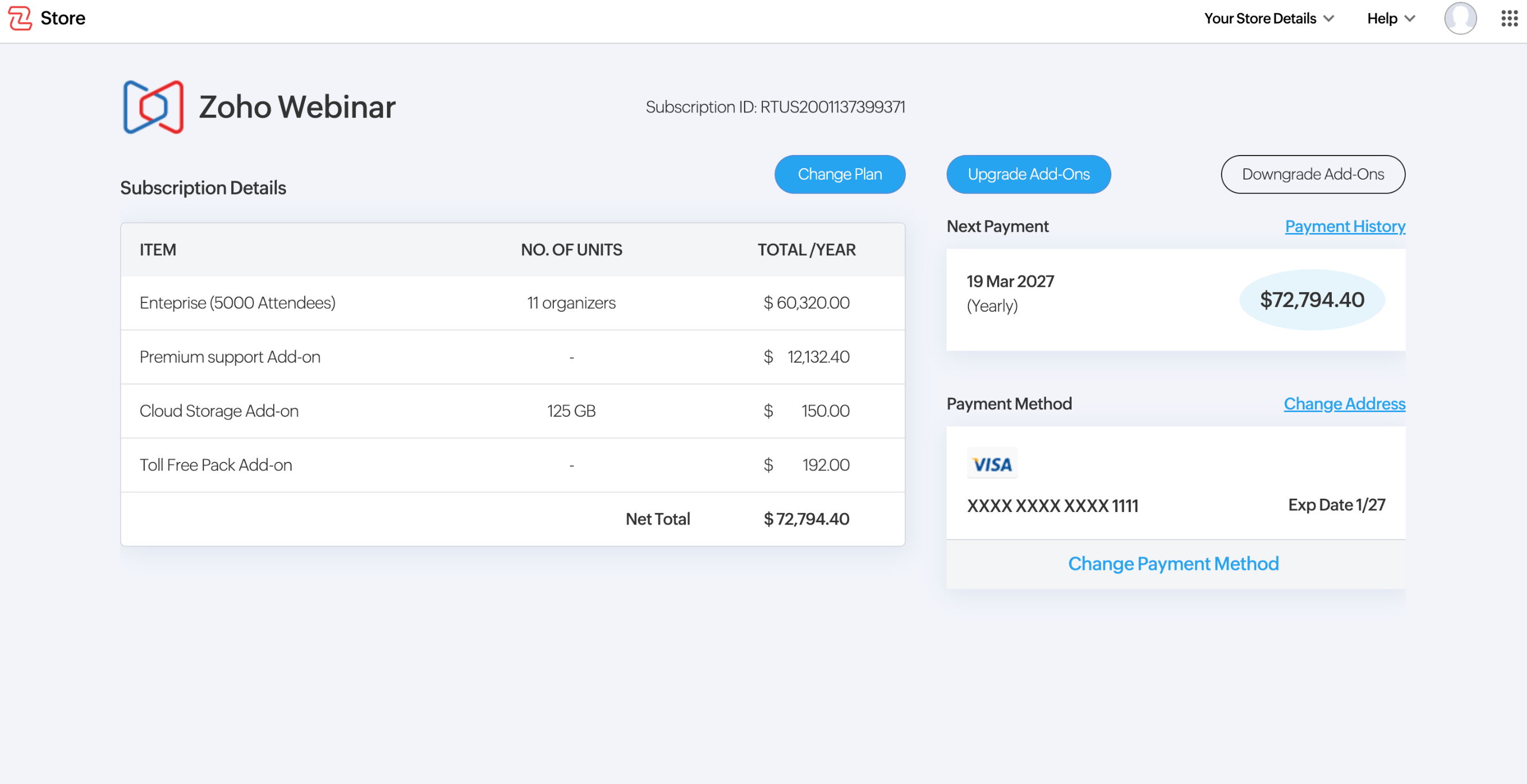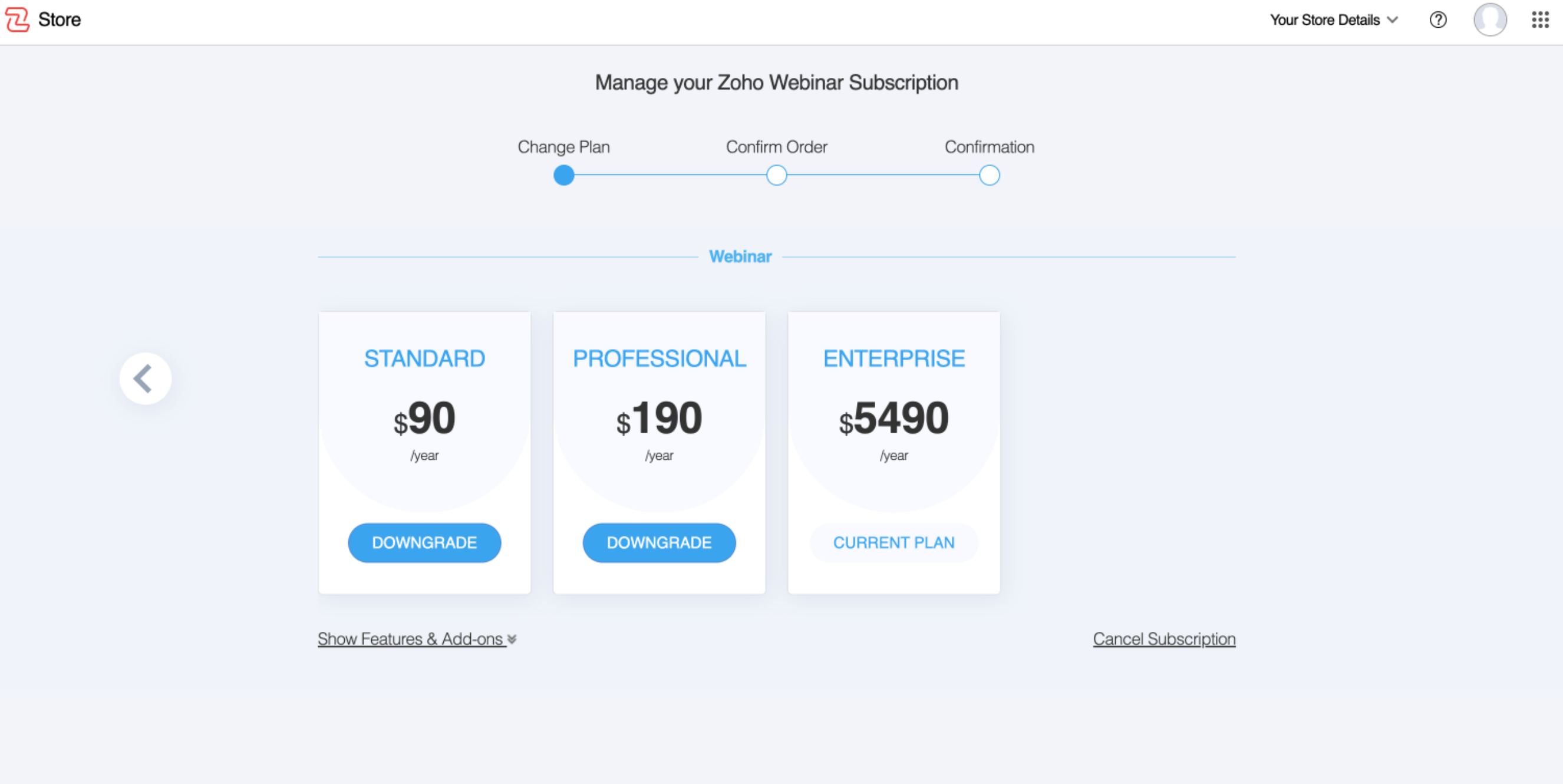 Manage your Zoho Webinar subscription with ease. Purchase plans, add-ons, or upgrade and downgrade your account by following the steps below.