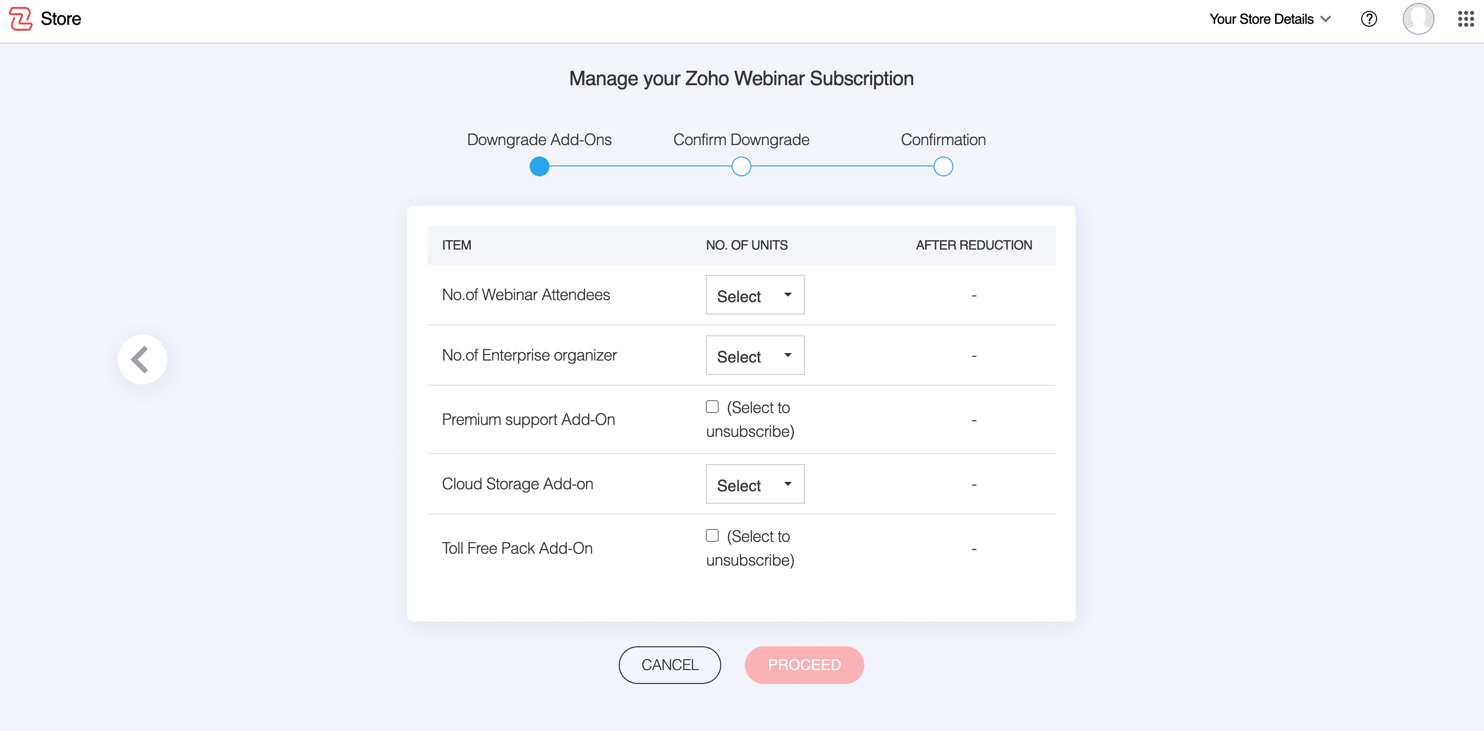 Reduce the number of organizers, attendees and select the add-ons you want to downgrade.