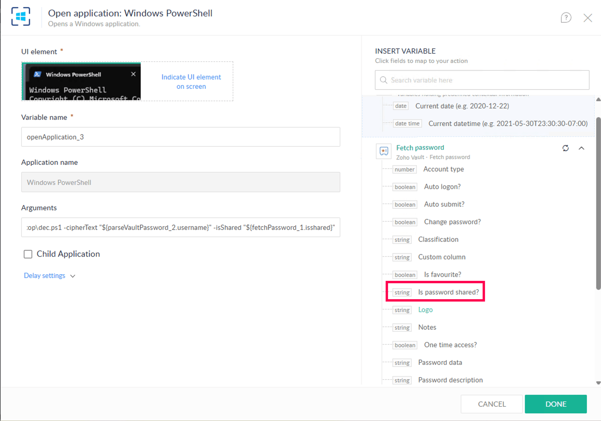 -- powershell.exe -NoProfile -NoExit -ExecutionPolicy Bypass -File <replace_file_path> -cipherText "${parseVaultPassword_2.password}" -isShared "${fetchPassword_1.isshared}" -displayValue "NO"