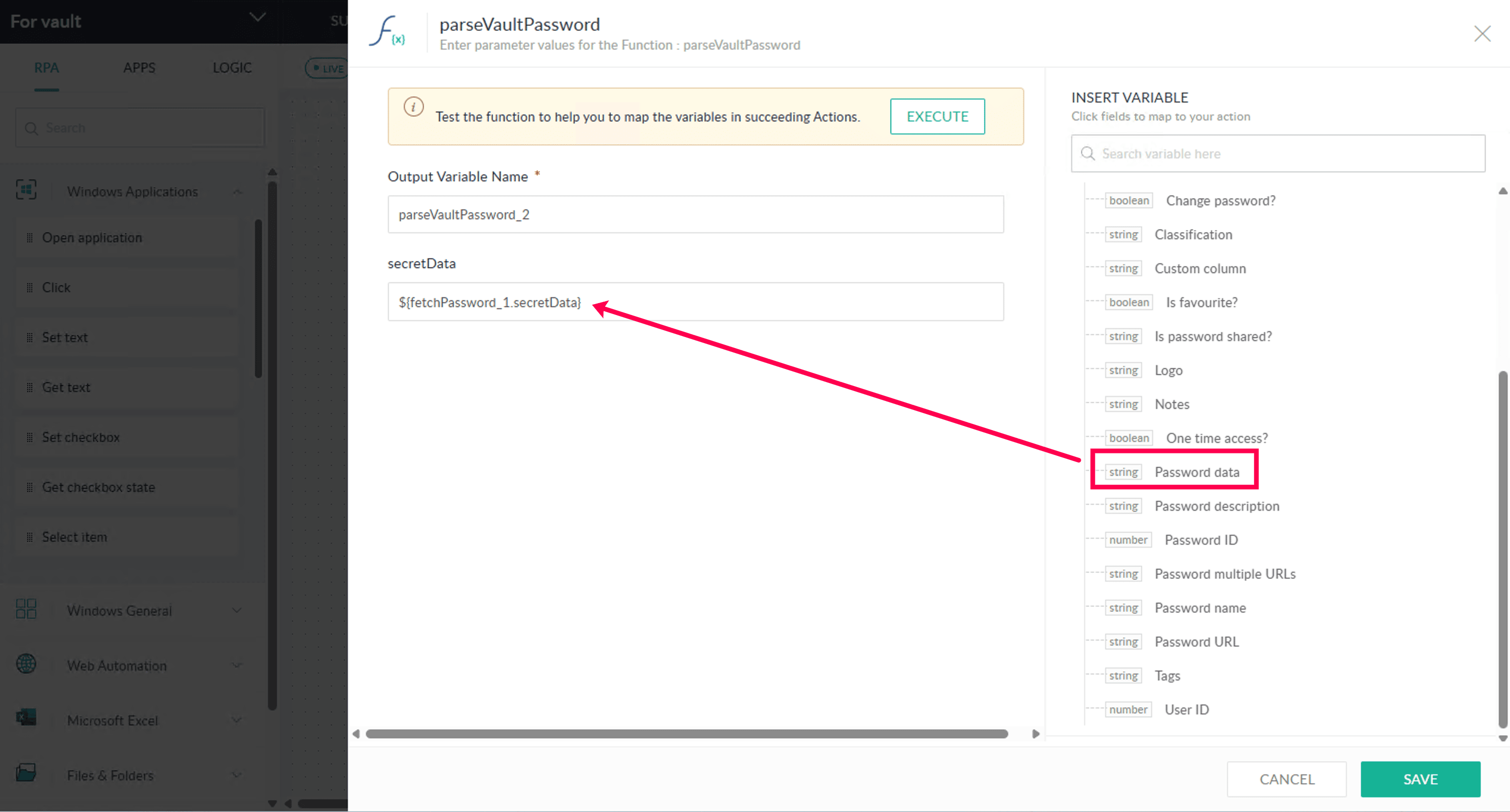 2. Use this function in the workflow, and make sure you map the password data as the input to it.