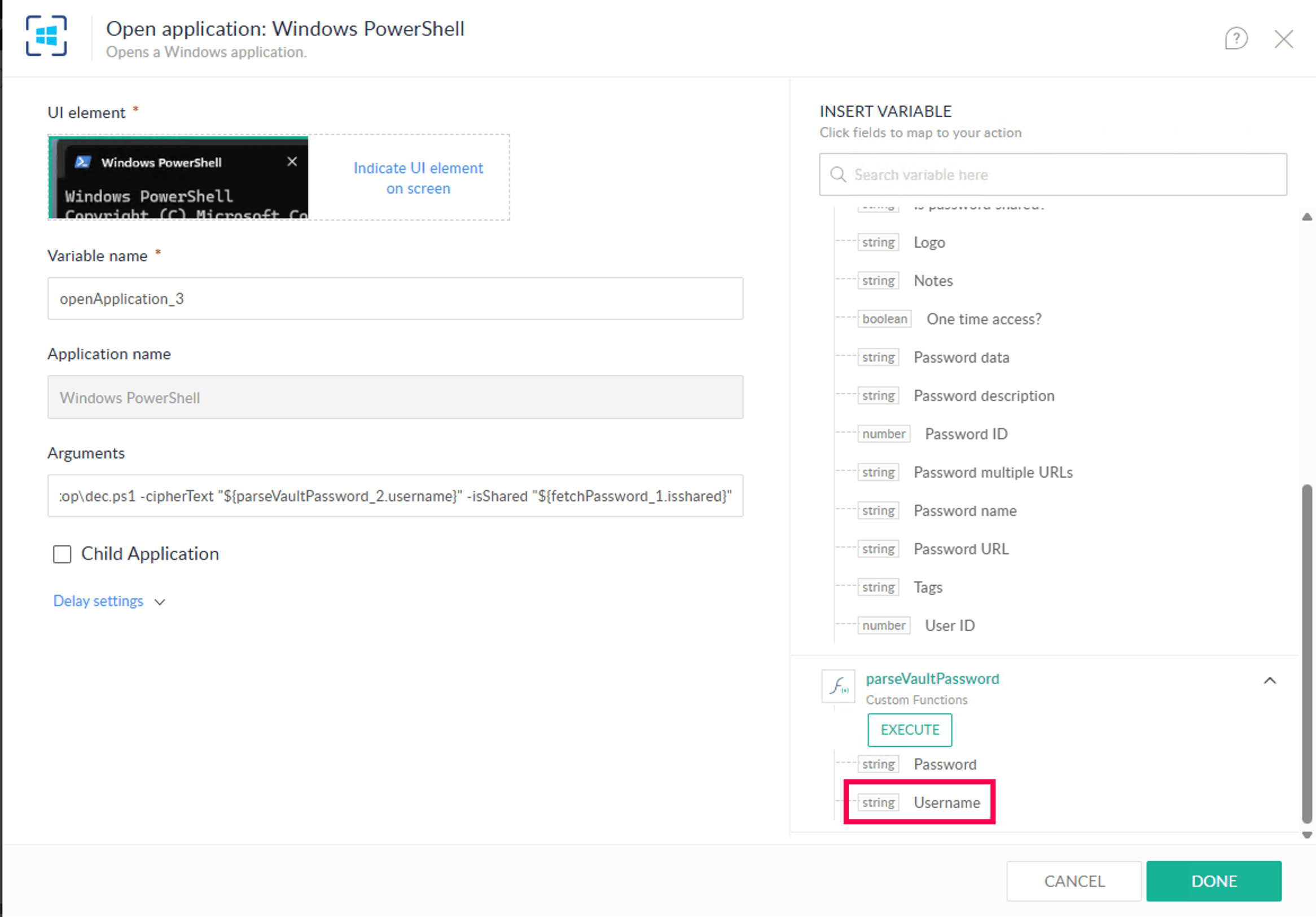 ${parseVaultPassword.username} - username output from the parseVaultPassword custom function. (See the screenshot below.)