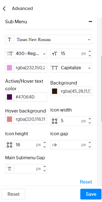 3. You can change the submenu text's font style, font thickness, font size, font color and letter case.