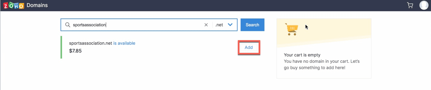 If the required domain is available, it will appear as shown below. Click Add to add it to your cart.