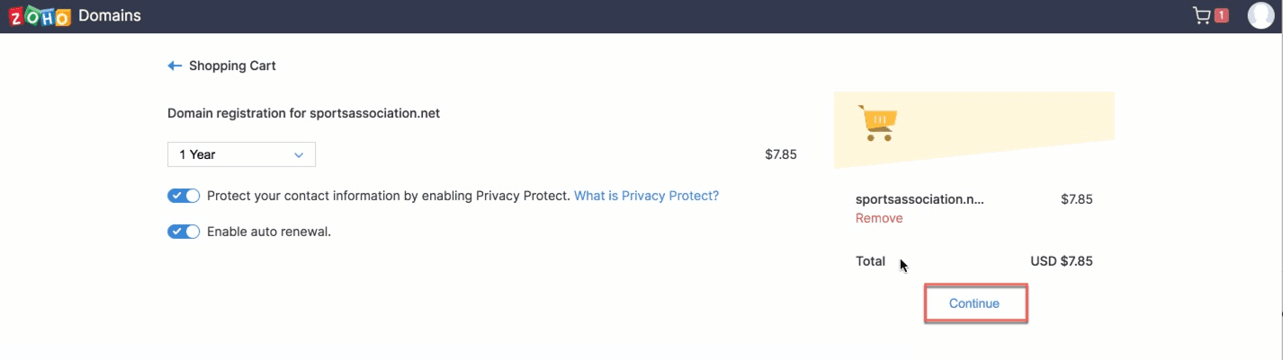 Select the number of years of renewal from the drop-down. Disable Privacy Protect or Auto Renewal if you do not require them. Click Continue to proceed.