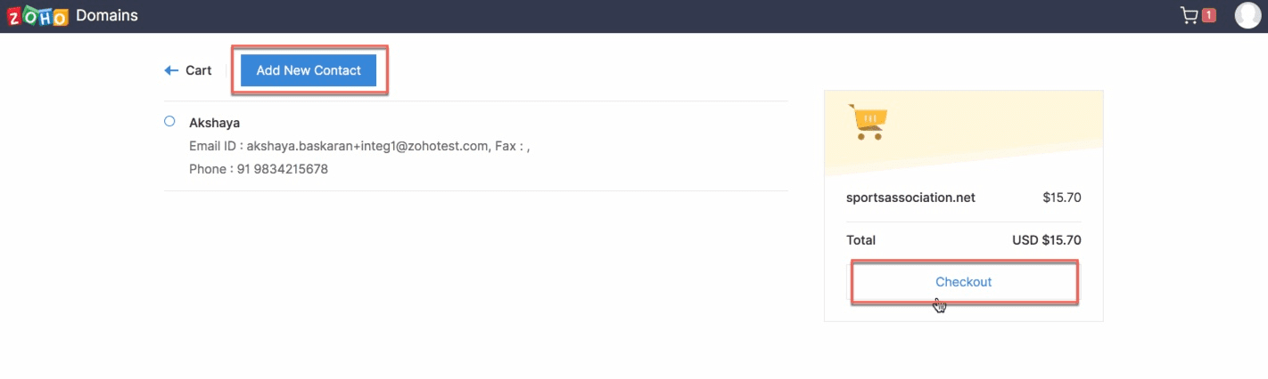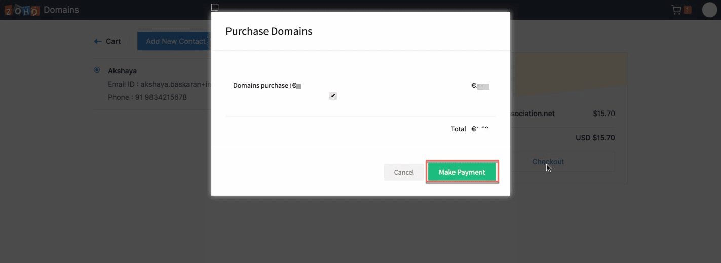 Final amount towards the domain purchase will be displayed. Click Make Payment.
