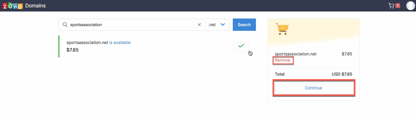 Click Continue in the Buy a New Domain section. You will now be able to buy custom domains from Zoho Domains.