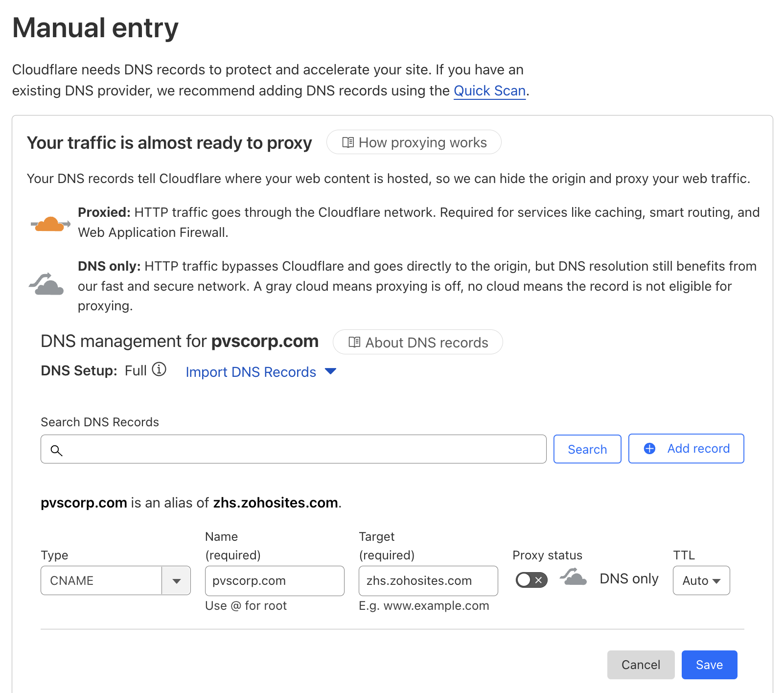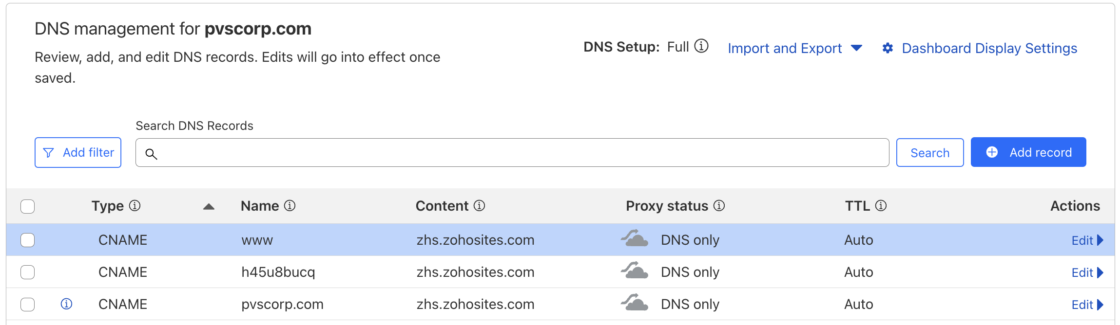 13. Similarly add CNAME entry for token displayed in Zoho Sites domain verification dialog.