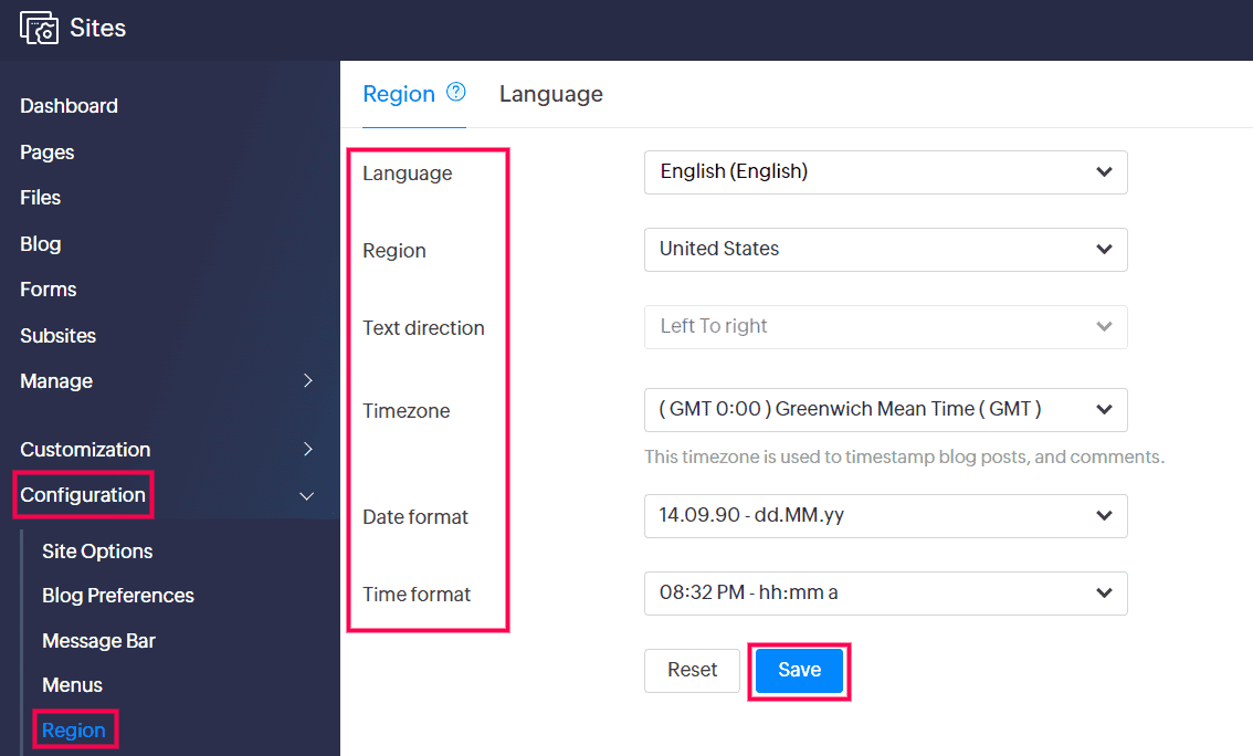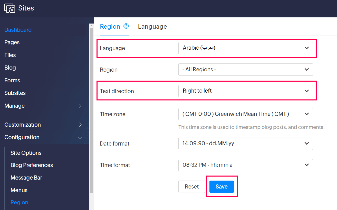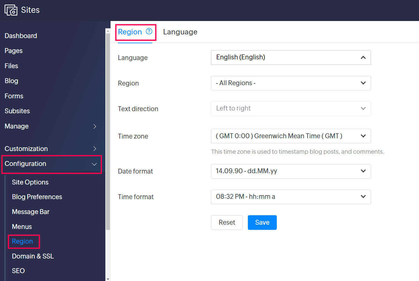 This feature enables you to update the region preferences for your website. This will make it easier to display dates and times in a format most suited for a given region. You can also change the text direction based on the selected language.