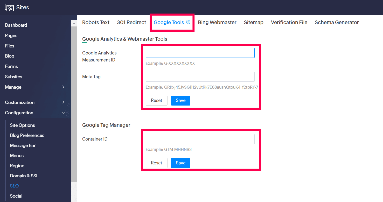 1. For Google Analytics and Webmaster tools, provide Google Analytics Measurement ID. You can find out more about it here.
