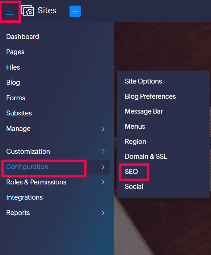 Writing blogs on relevant topics and optimizing them will position your brand as an authority on subjects that intrigue and matter to the audience. Find ways to optimize your blog with Zoho Sites. Click the hamburger menu icon and select Blog from ...