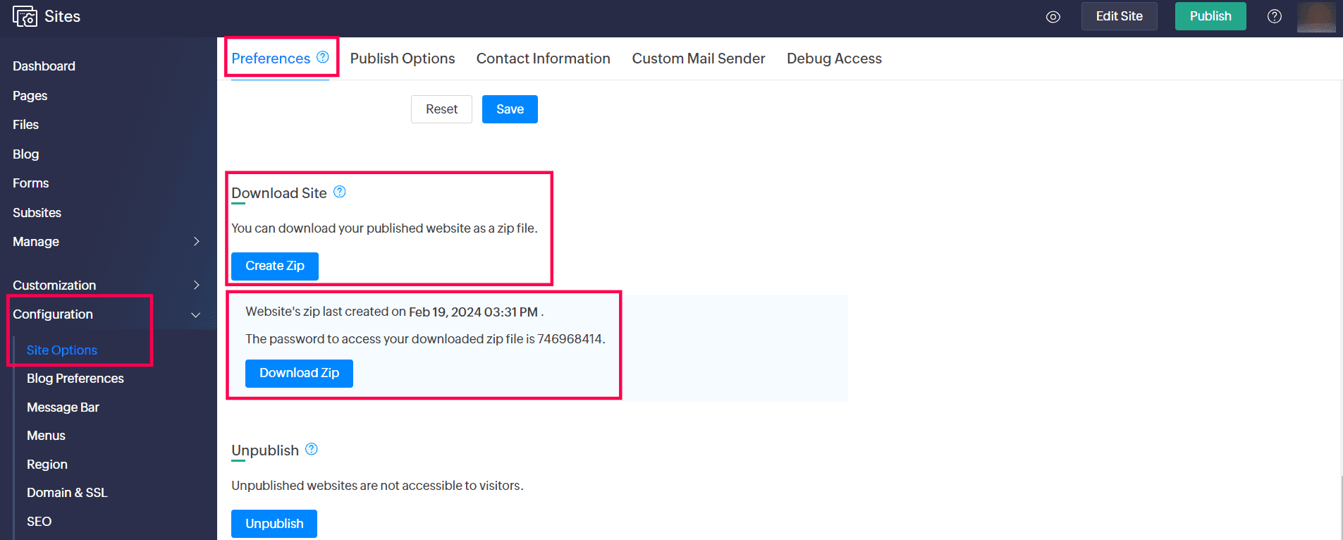 When you no longer require a website, you can unpublish the site. You will be able to republish this site at a later date, if needed. To do this, follow the steps given below: Go to Configuration -> Site Options. Select Preferences. Click Unpublish ...
