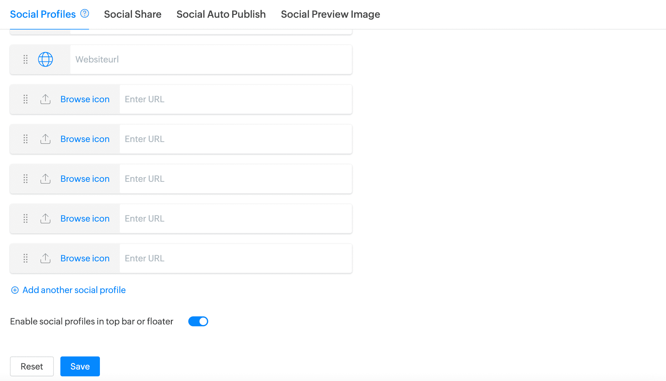 2. Click on the Social Profiles tab. You can see the list of social media platforms that you can add to your site.