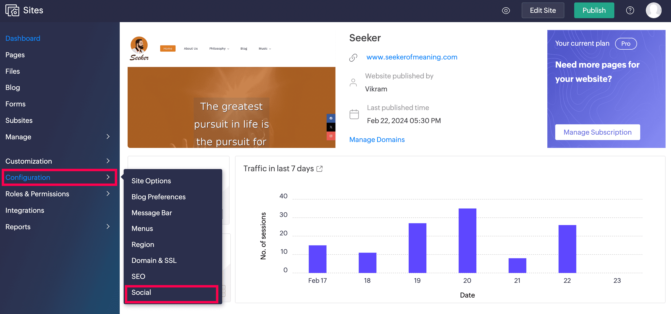 Harness the power of social media with Zoho Sites’ customizable social share icons. Enabling Social Share buttons allows visitors to share your blog content on their social media channels. Lets see how you can enable the Social Share option. Go to ...