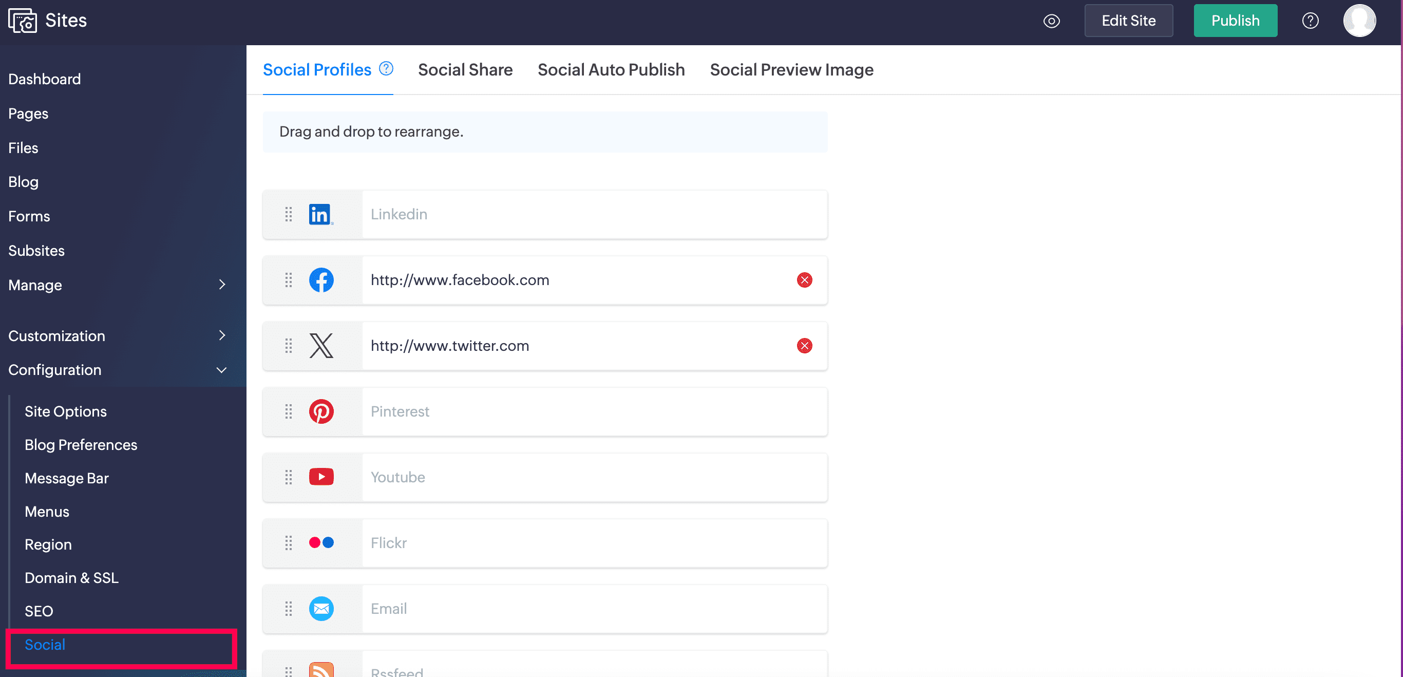 1. Go to Zoho Sites dashboard,  and access Configuration -> Social.