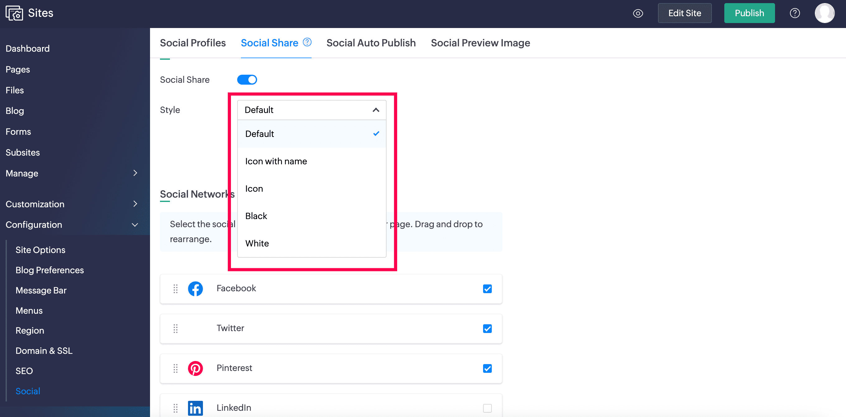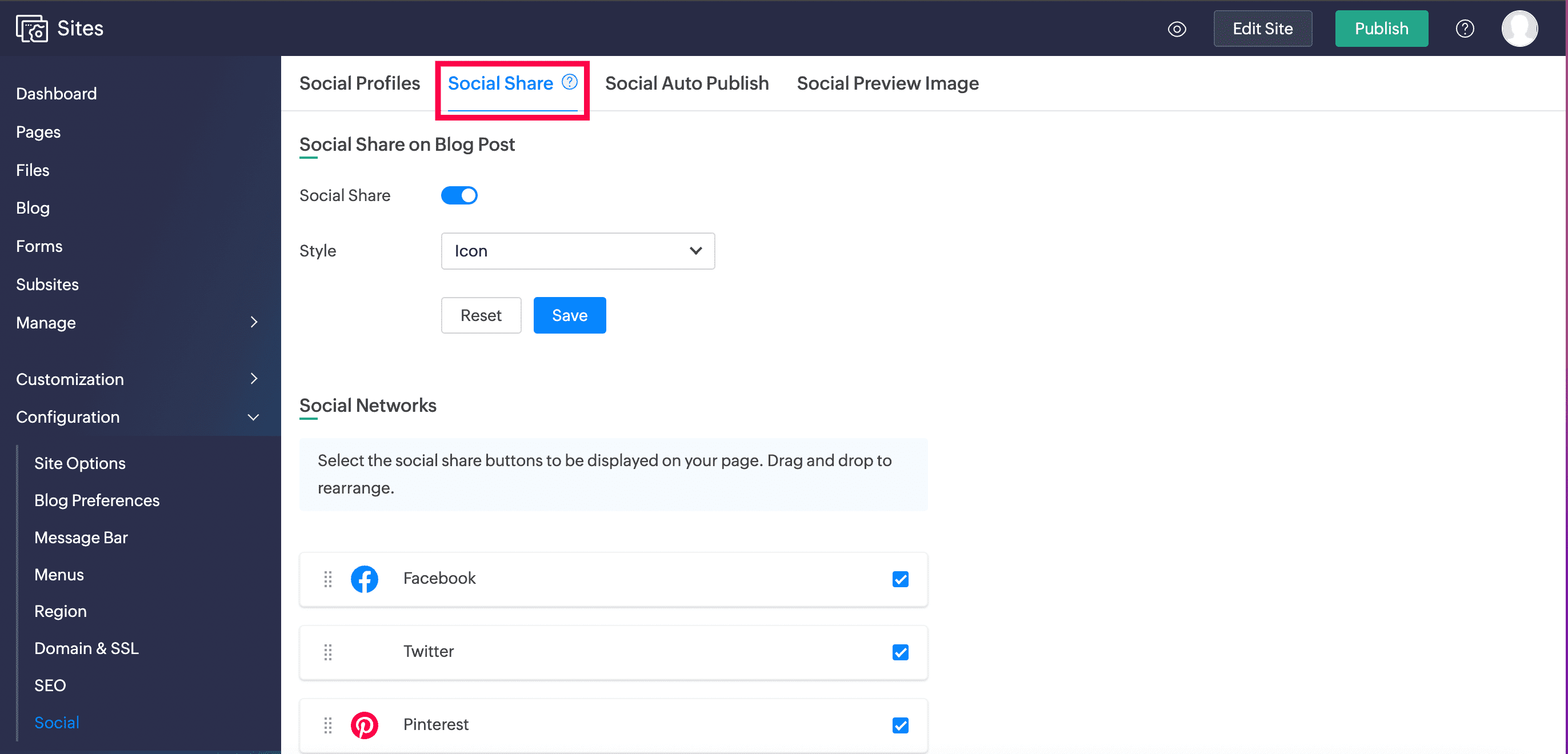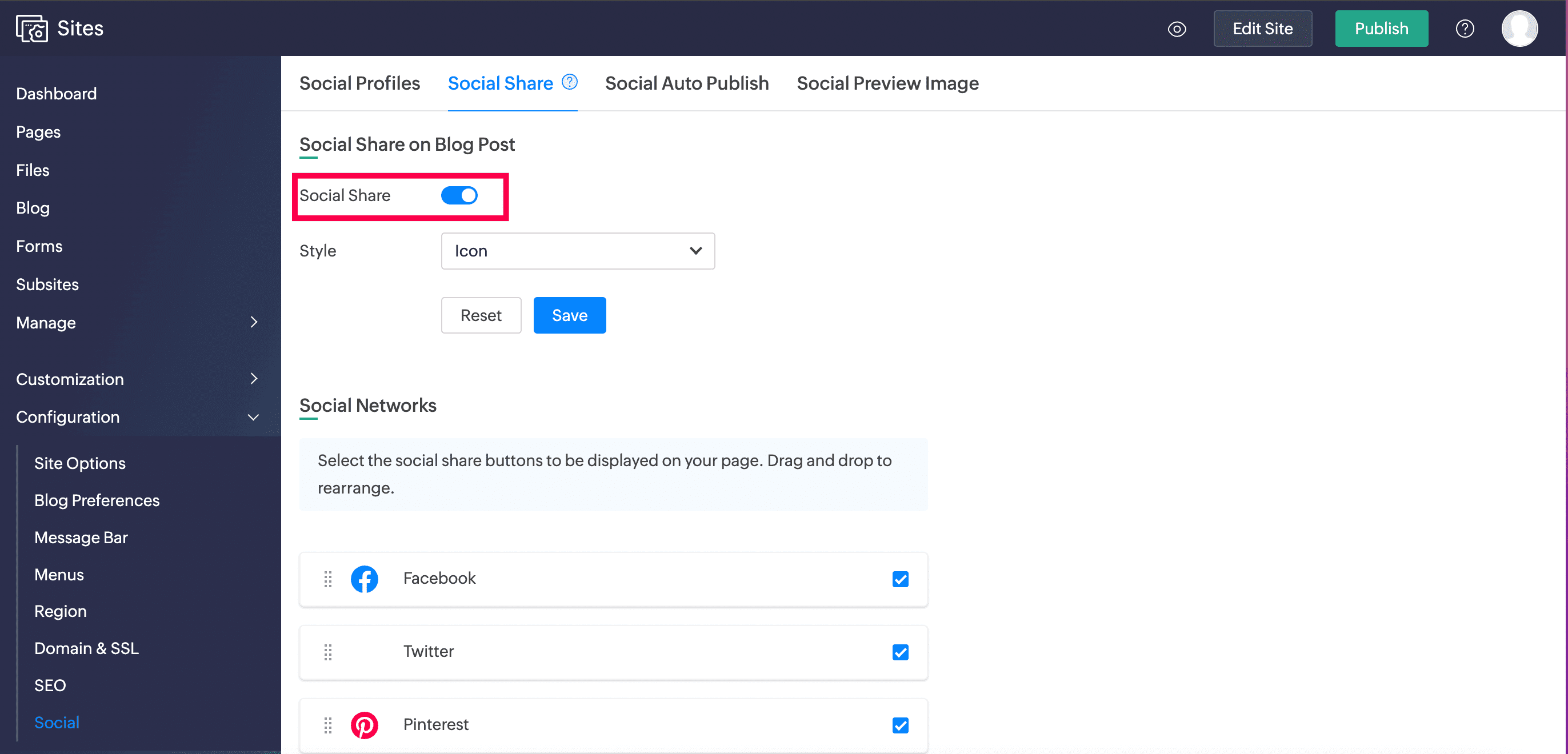 Harness the power of social media with Zoho Sites’ customizable social share icons. Enabling Social Share buttons allows visitors to share your blog content on their social media channels. Lets see how you can enable the Social Share option.