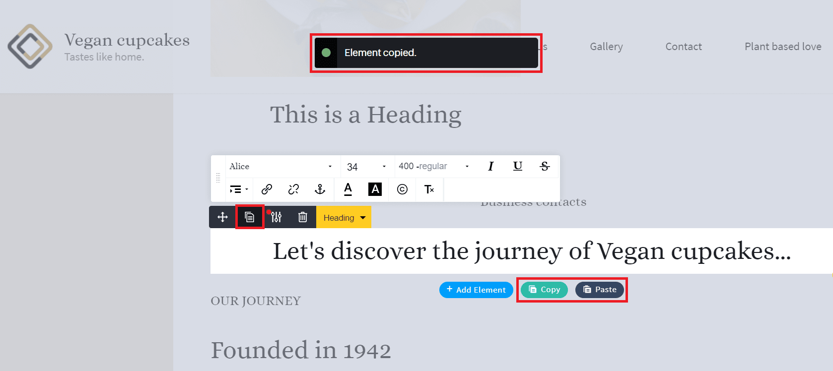 Click the element that you would like to duplicate. Click the clone icon and you will see a notification on your screen reading "Element copied." You can also use the Copy button at the bottom of the element or section.