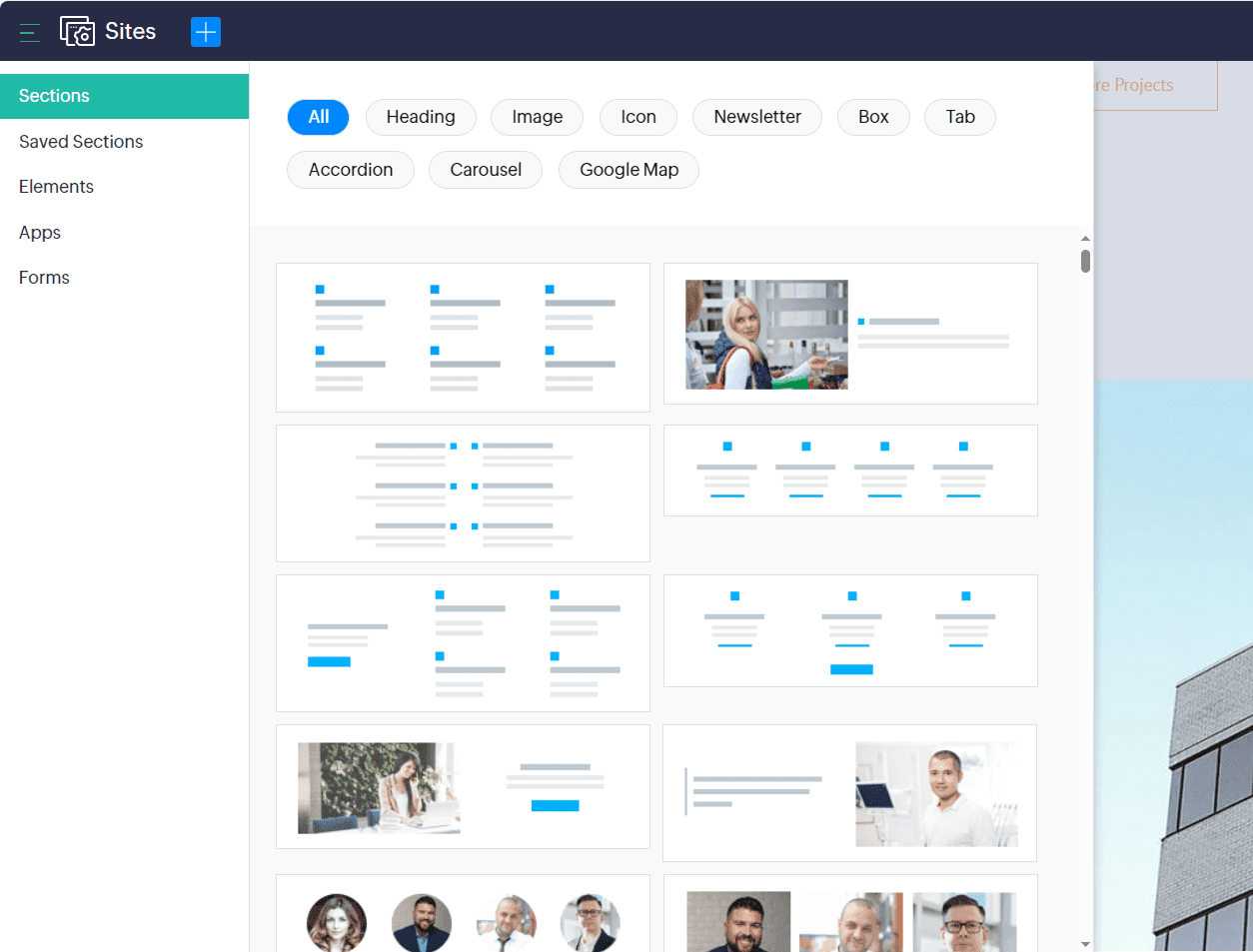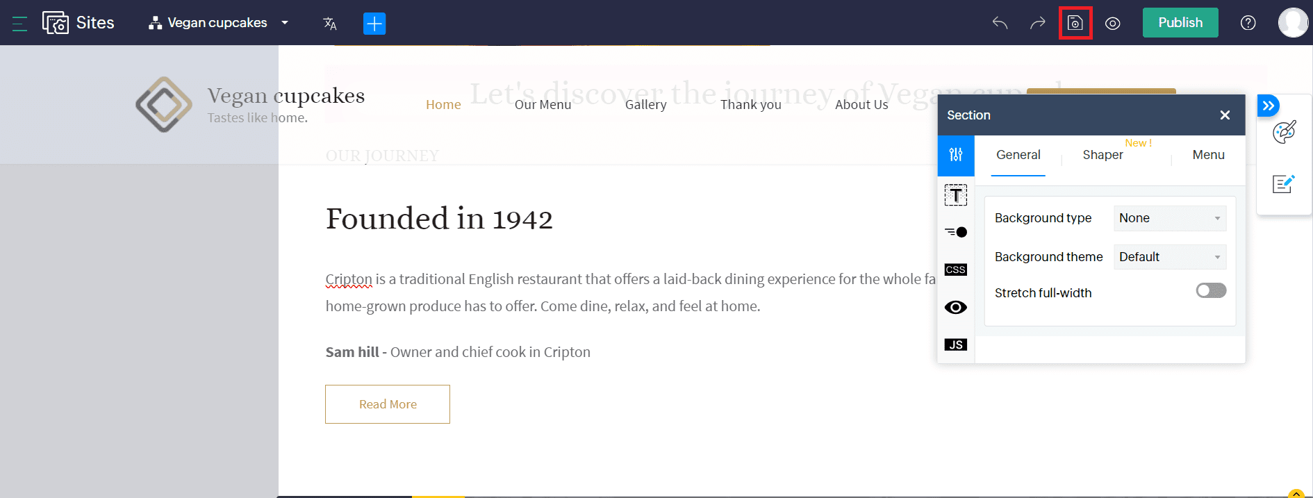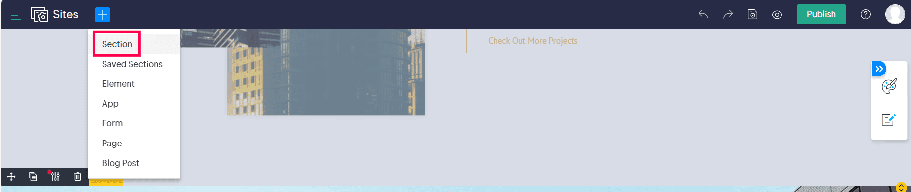 The Zoho Sites builder has an auto-save feature that automatically saves your work as you continue to create your site. You can also manually save your work using the Save option. To save manually, click the save icon in the top-right corner of your builder. Your progress will be saved instantly.