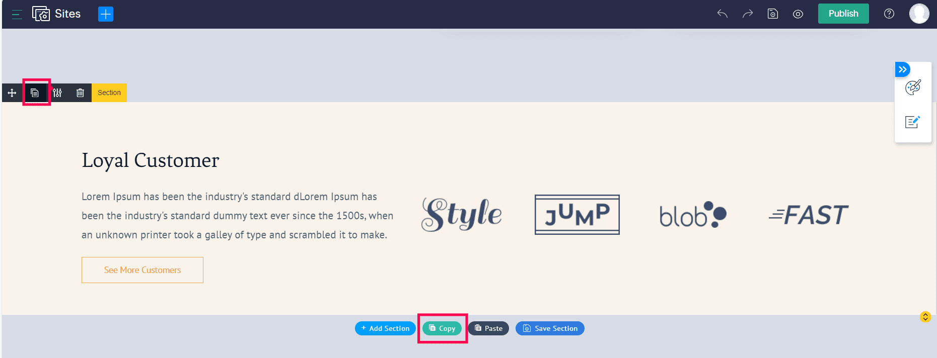 Access the section and click the Copy icon . You can also clone by clicking the green Copy button at the bottom of the selected section.