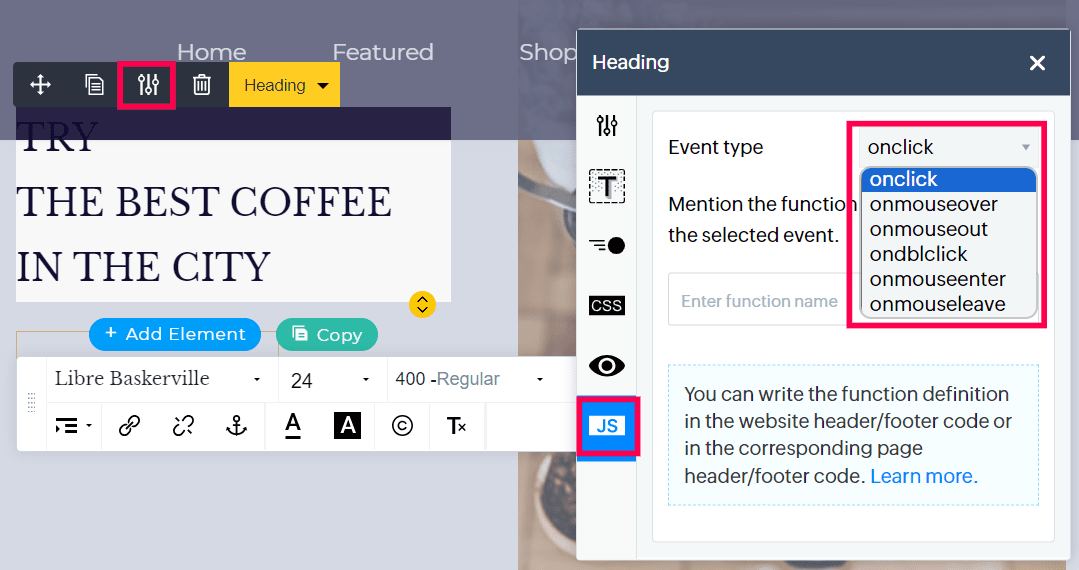 Attaching JavaScript events to elements on your website is a great way to enhance the interactivity and user experience of your site. You can attach JavaScript events to any element in your website. JS events are any instance of interaction with the page, via mouse, keyboard, or forms. This feature requires minimal JavaScript knowledge.