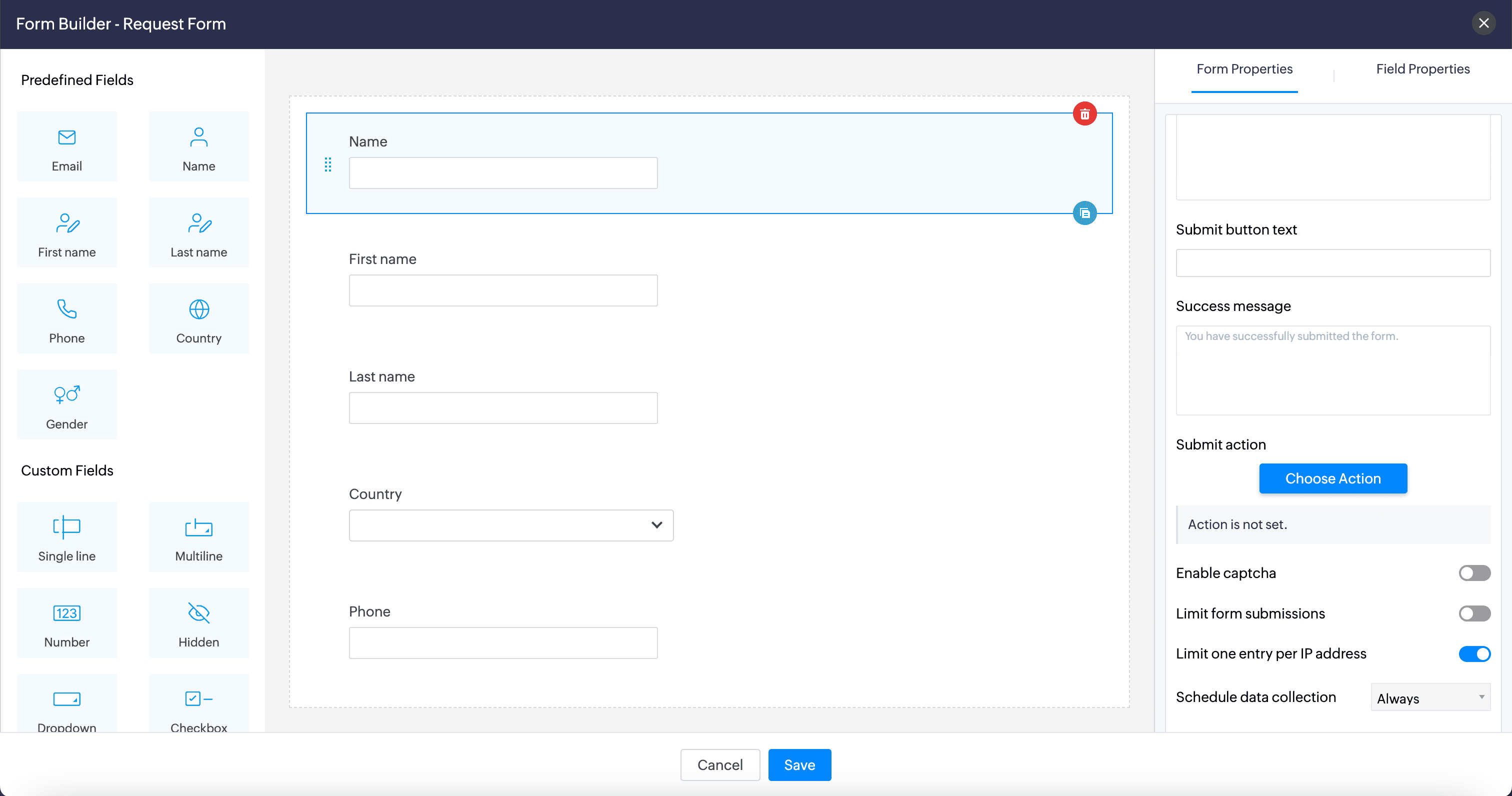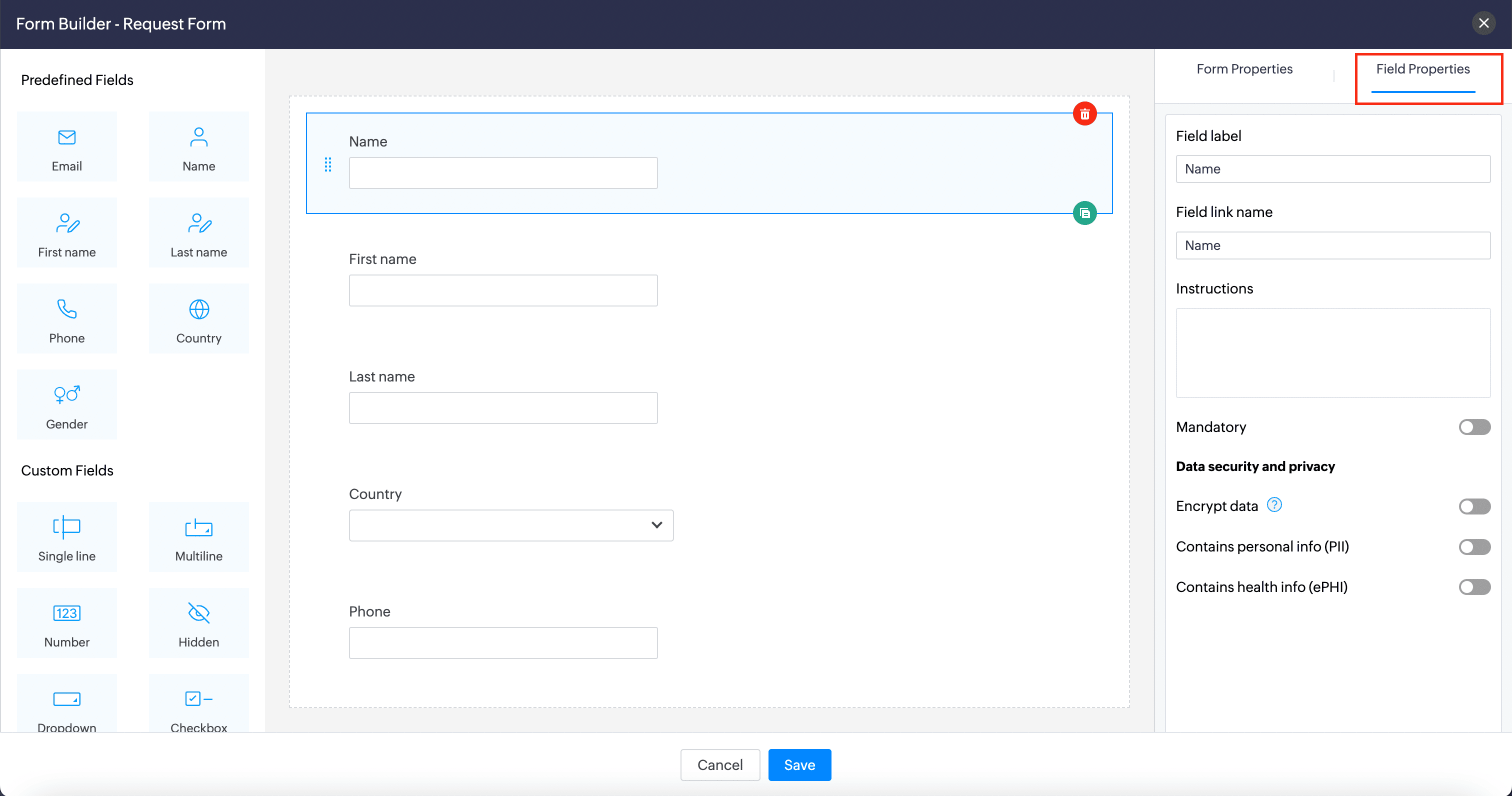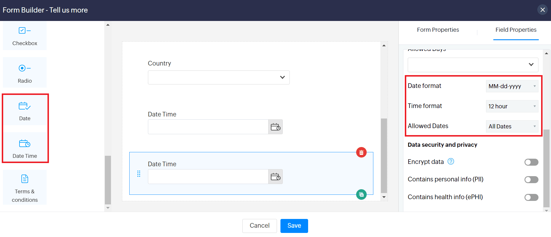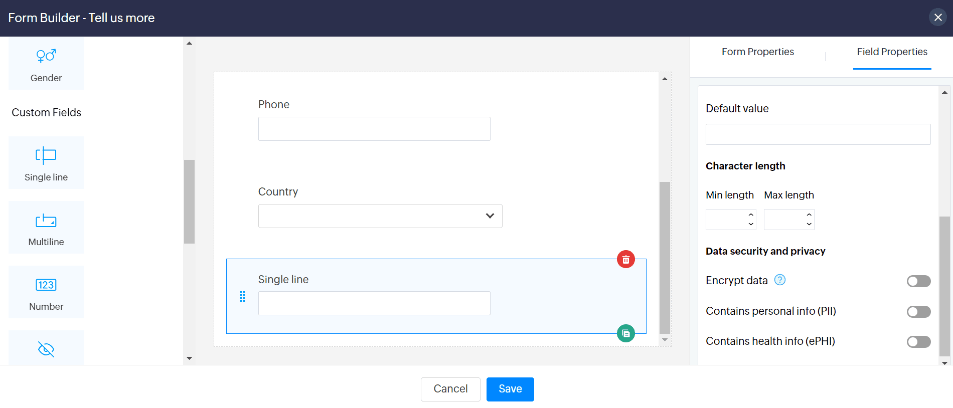 This section covers the unique properties of all the custom fields available in Zoho Sites Forms: