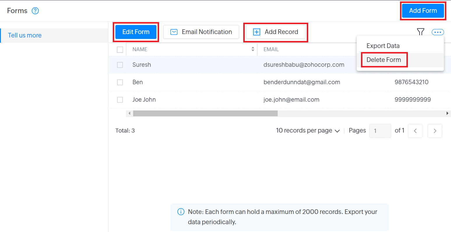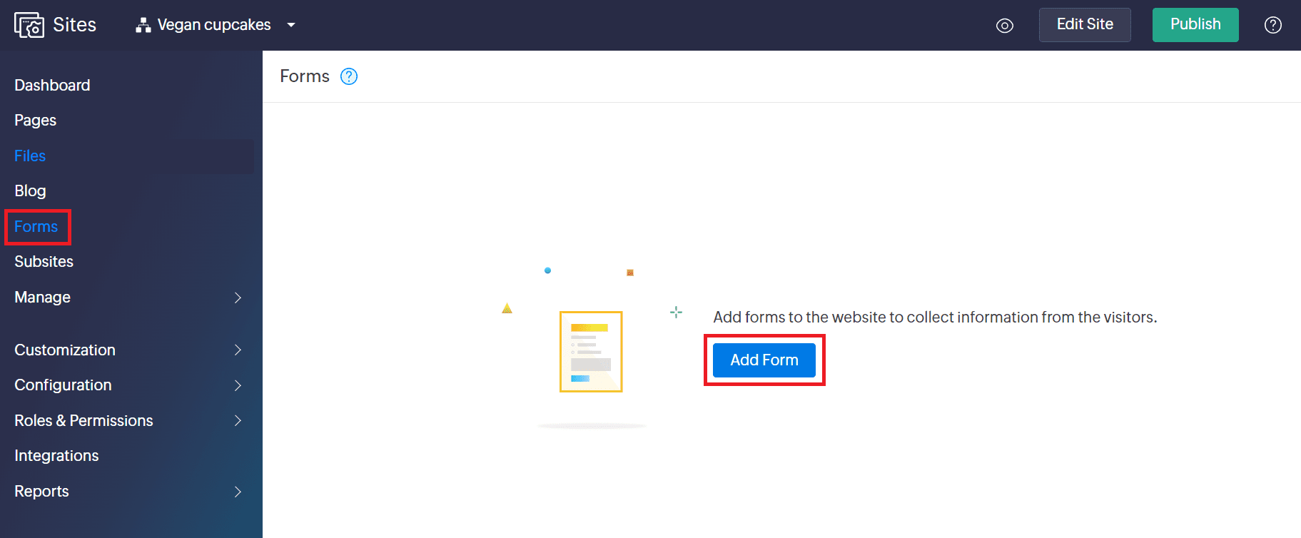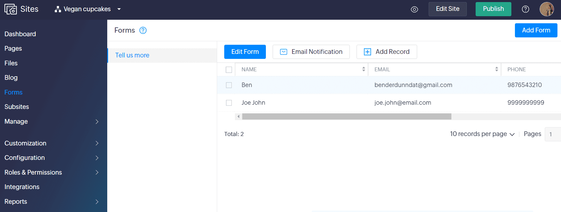 Web forms help businesses collect important customer information, such as their name or email address. This is crucial in building your sales funnel, tracking customer information, and for other important reasons, such as feedback or purchases. Zoho Sites allows you to create your own forms to capture data from your website visitors.