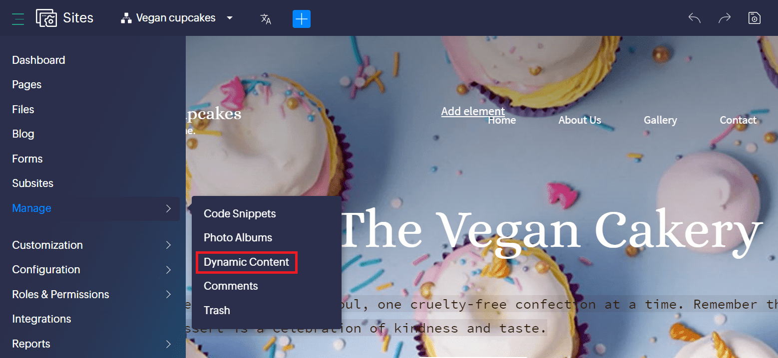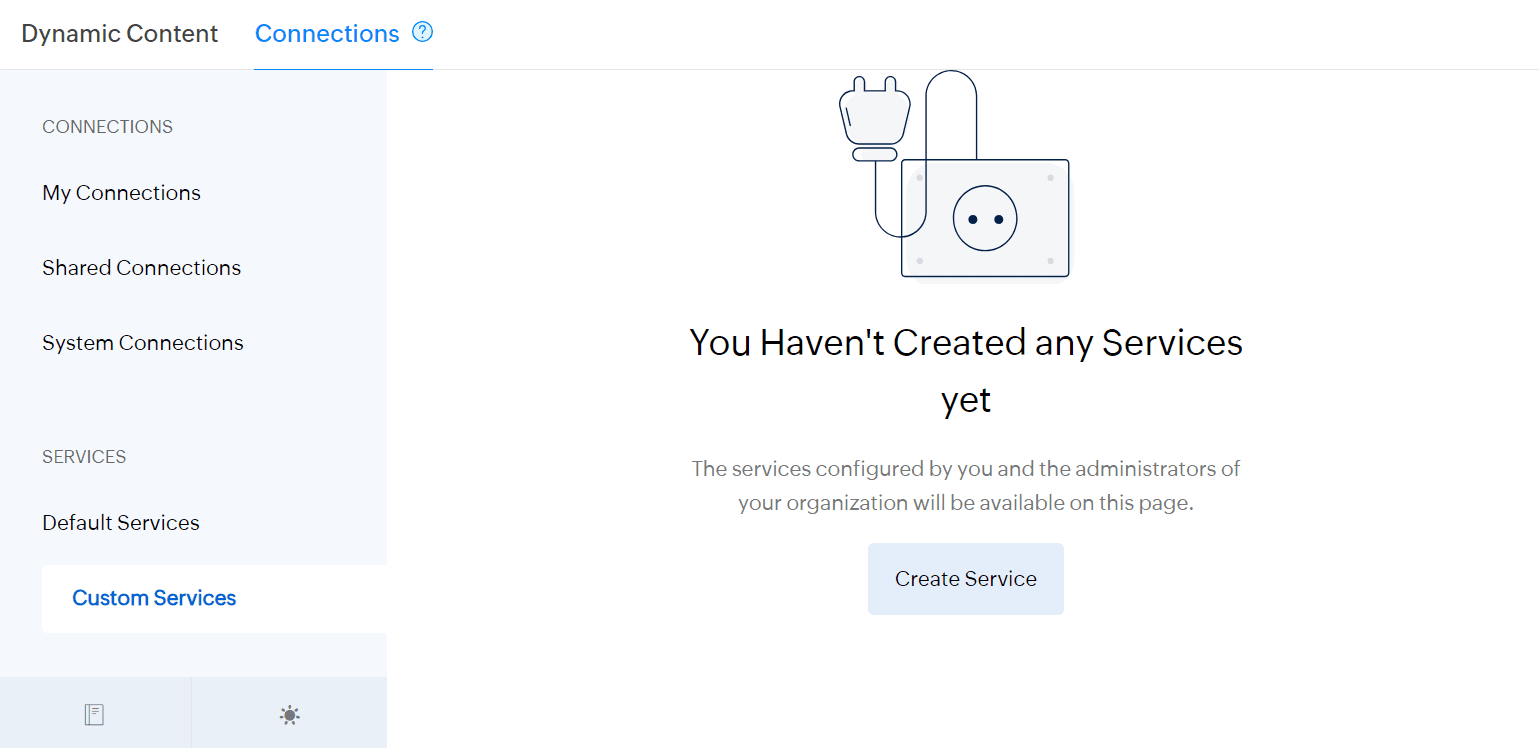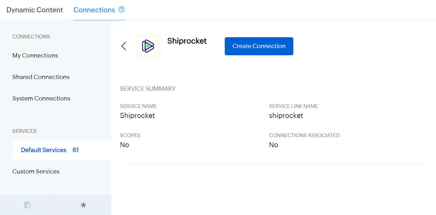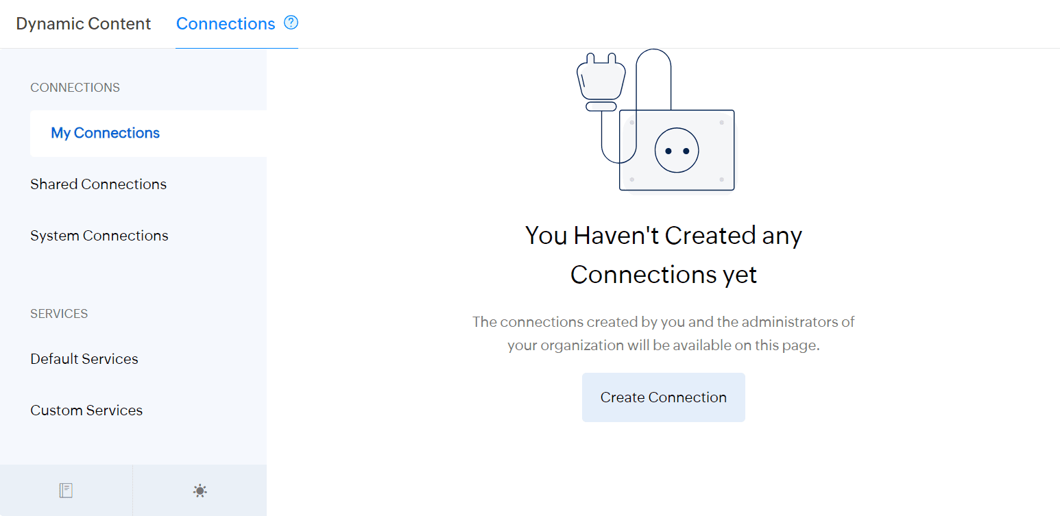 Perform the following steps to create a connection with a default service. Click Manage in the left menu pane on your Sites dashboard and navigate to Dynamic Content, then to the Connections tab.