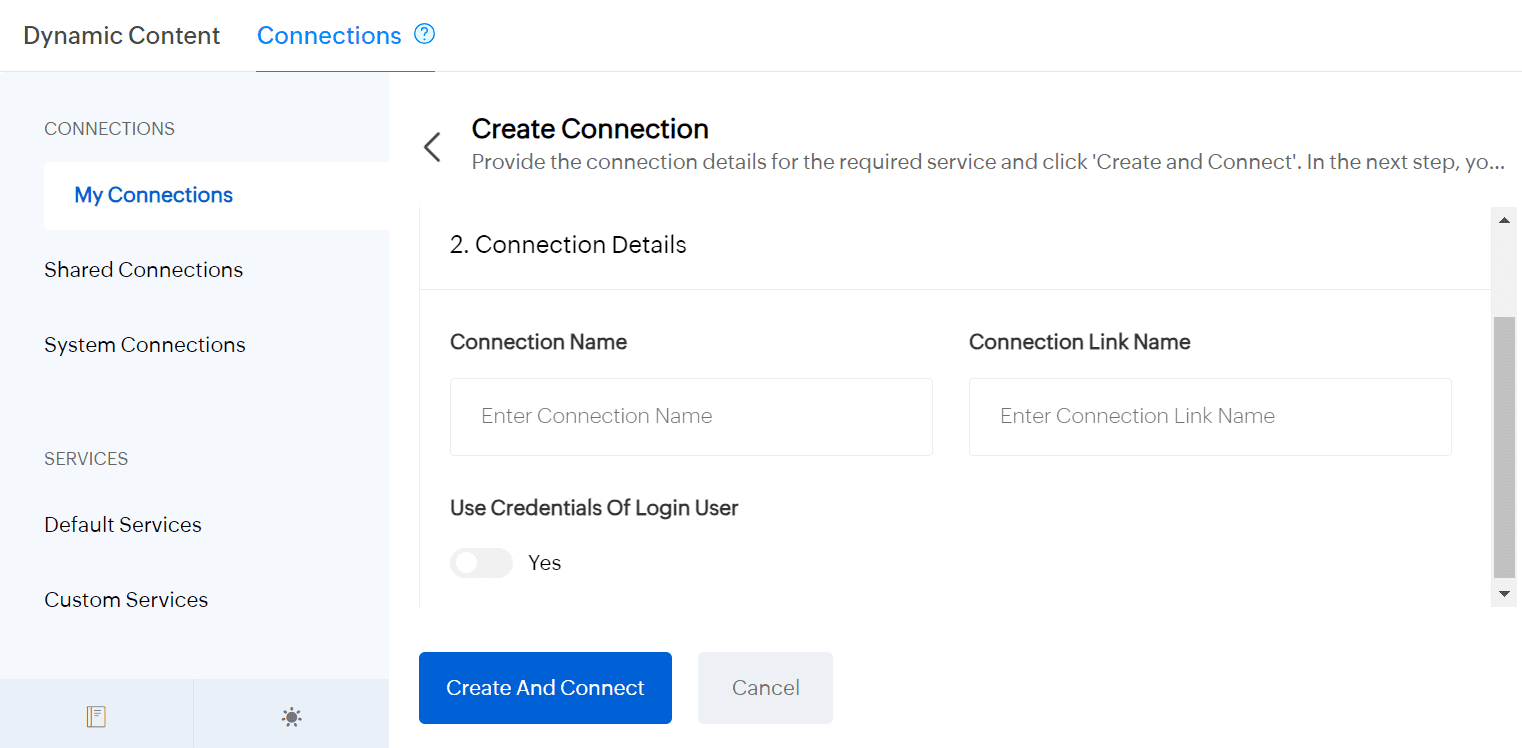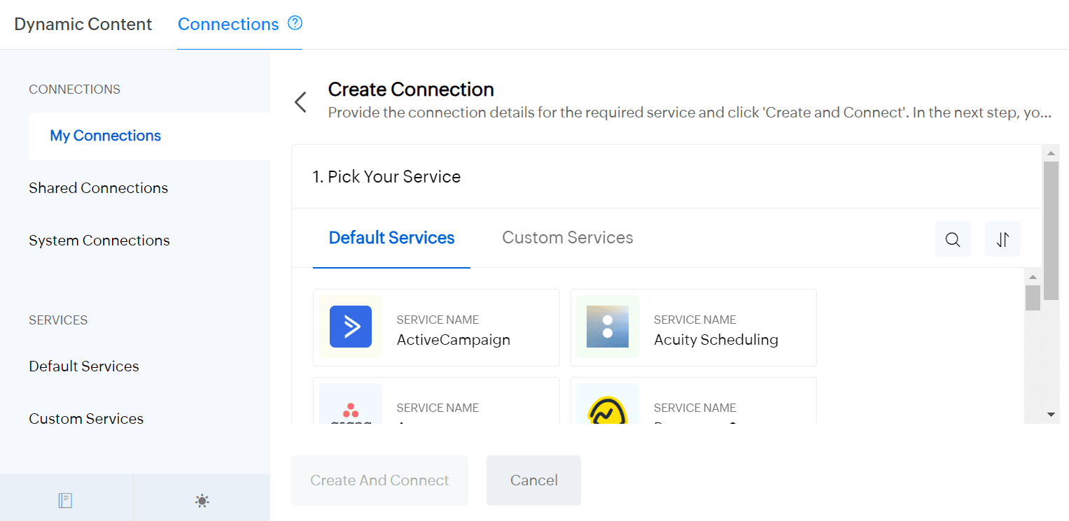You can click on Create Connection and click on the service under Pick Your Service to which you want to connect your Zoho Sites.