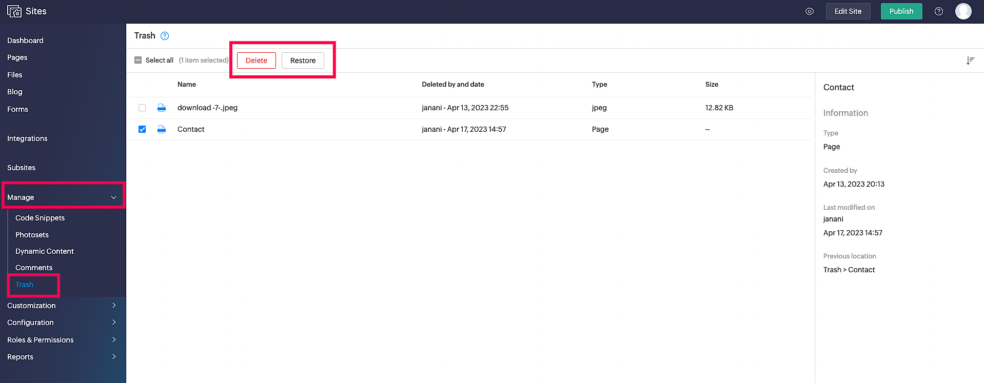 You can recover deleted pages or files from here. When you delete a page or file, it is not immediately removed from your website. Instead, it is moved to the Trash folder.