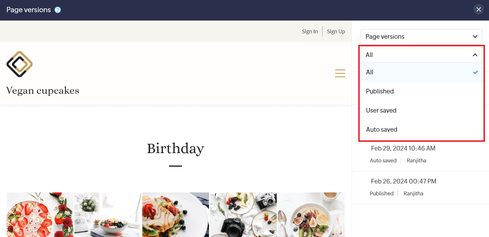 4. You can also filter the versions based on whether the page was Published, User saved, Auto saved, or simply access all versions by selecting the appropriate option.