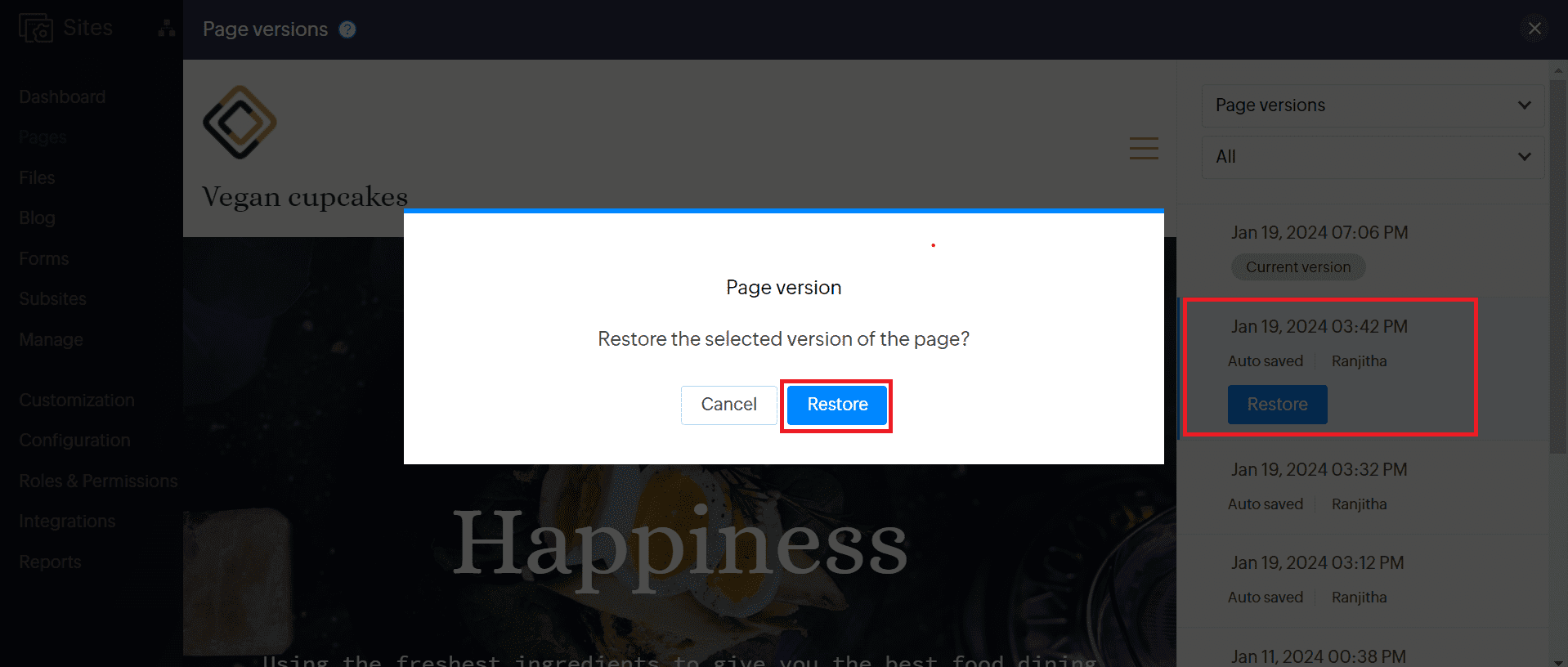 6. In the dialog box that pops up, click Restore if you are confident about switching back to the selected version.