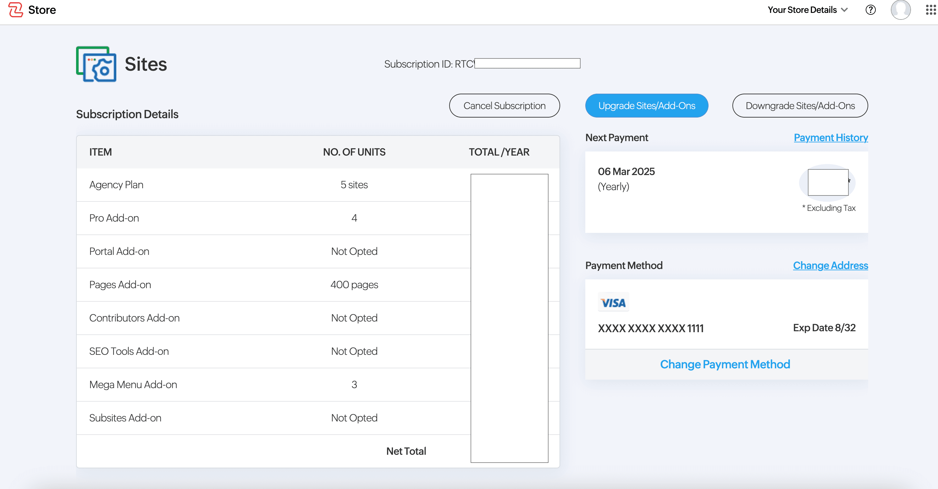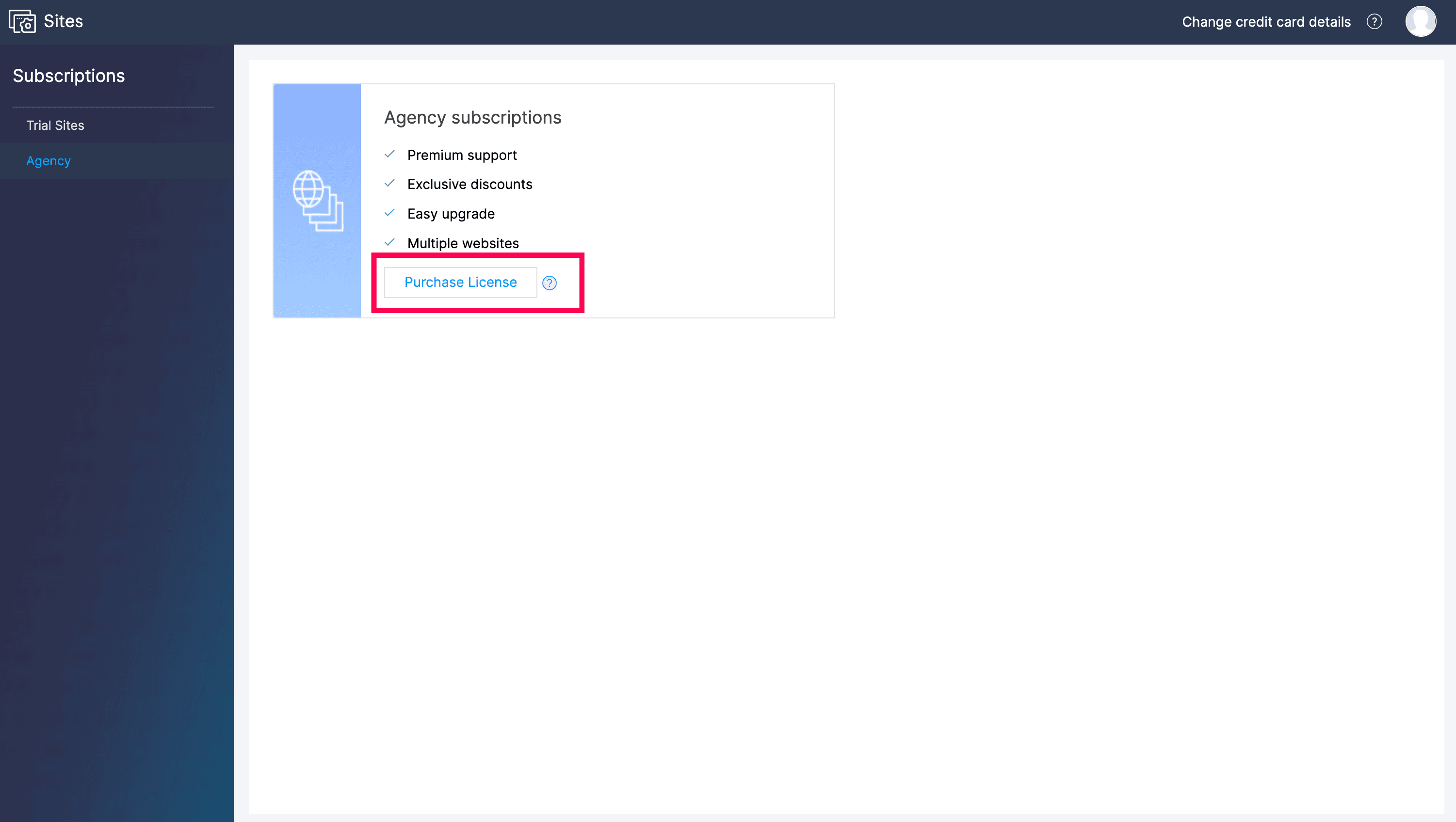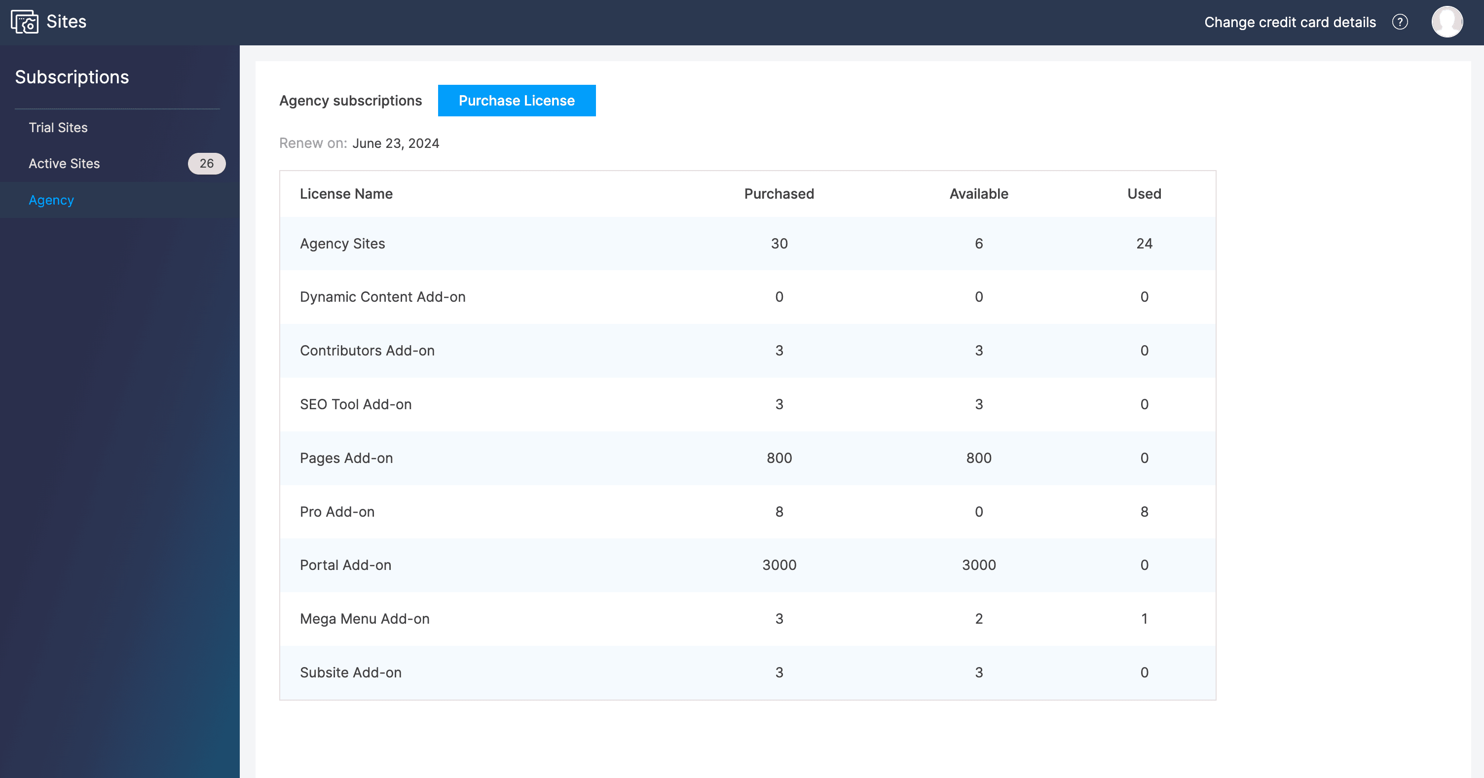 3. After purchasing an agency license, you can view the number of agency subscriptions purchased, the ones that are available for use, and the number of sites you've used. Purchase additional agency site subscriptions to add more websites.
