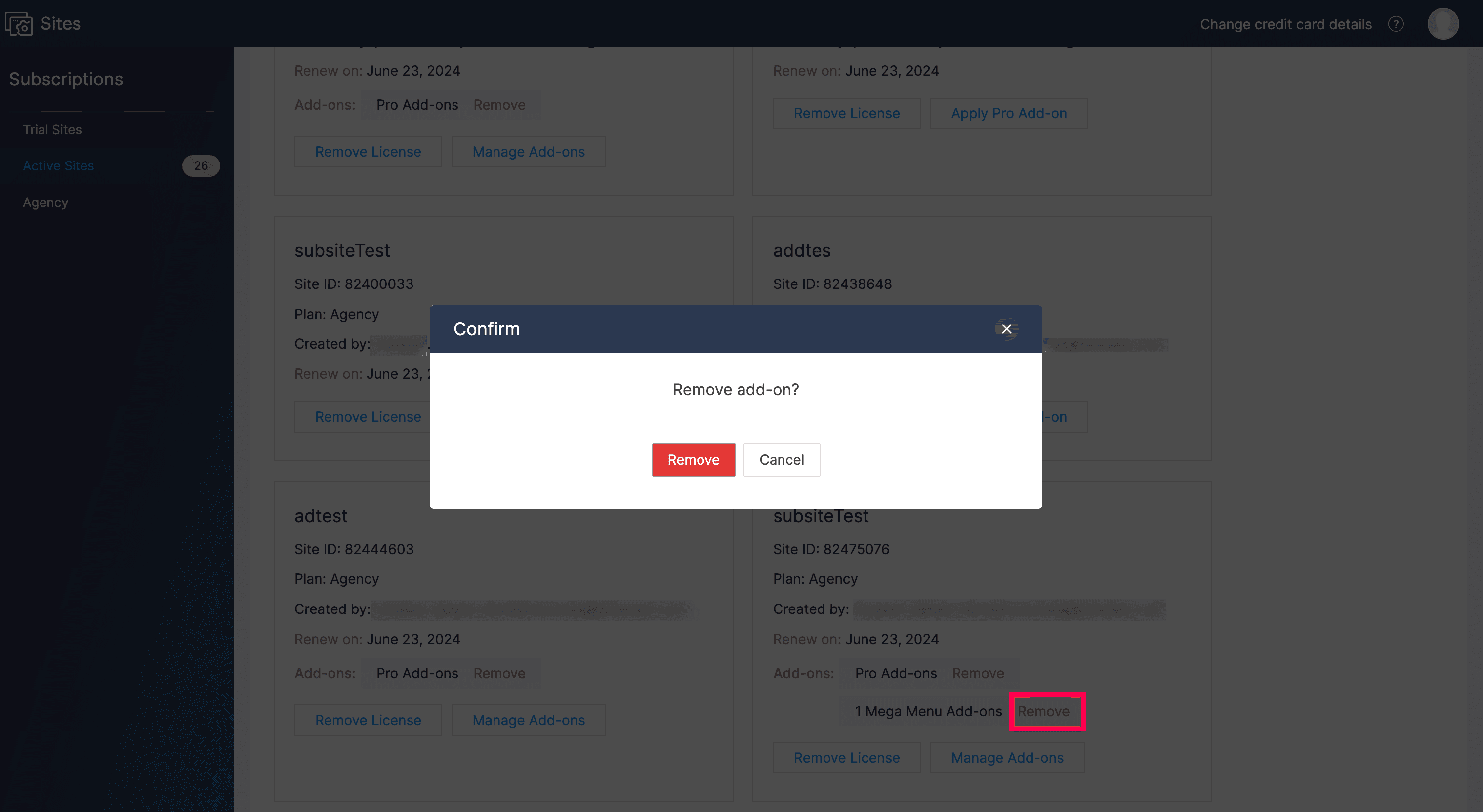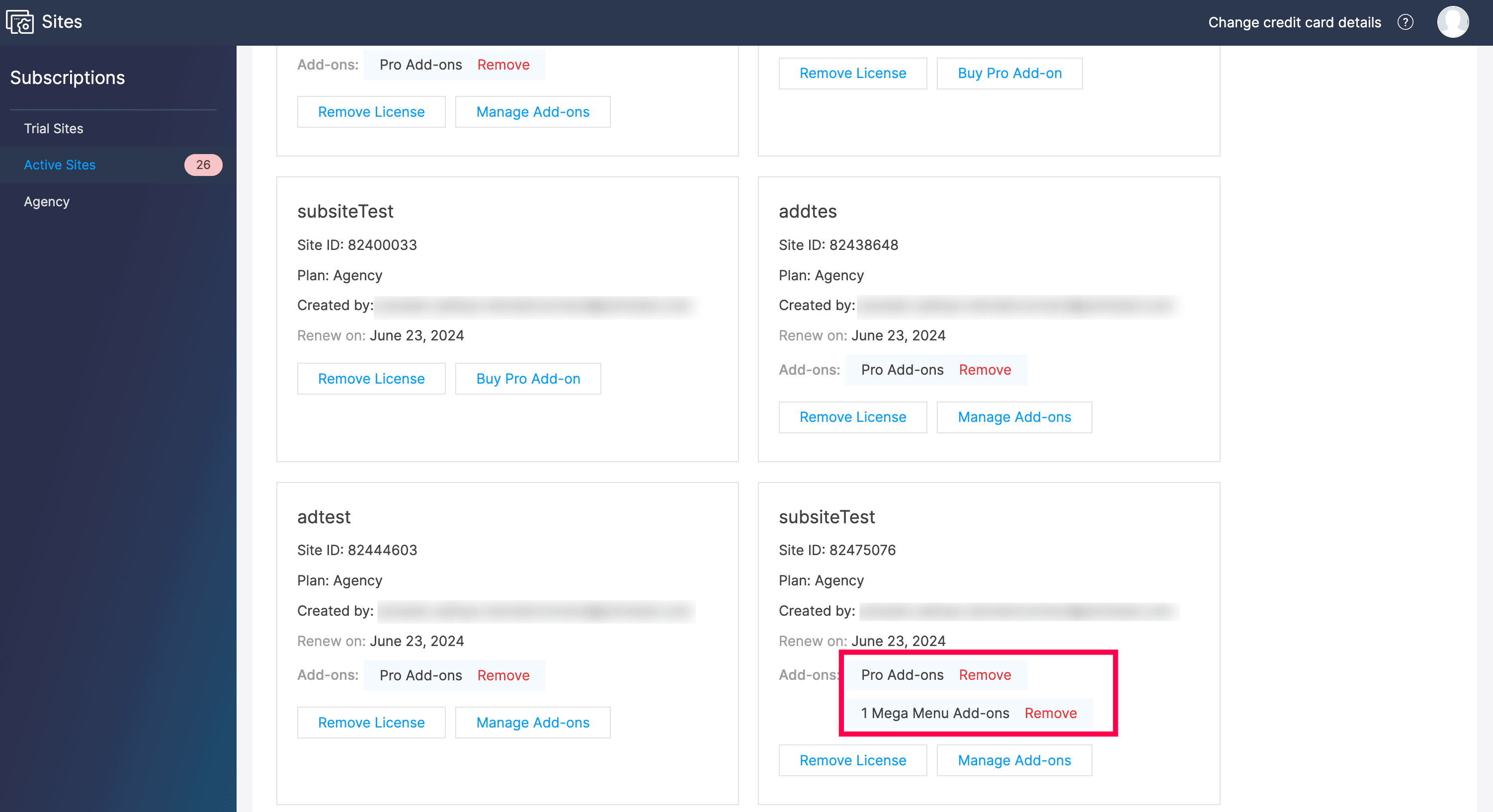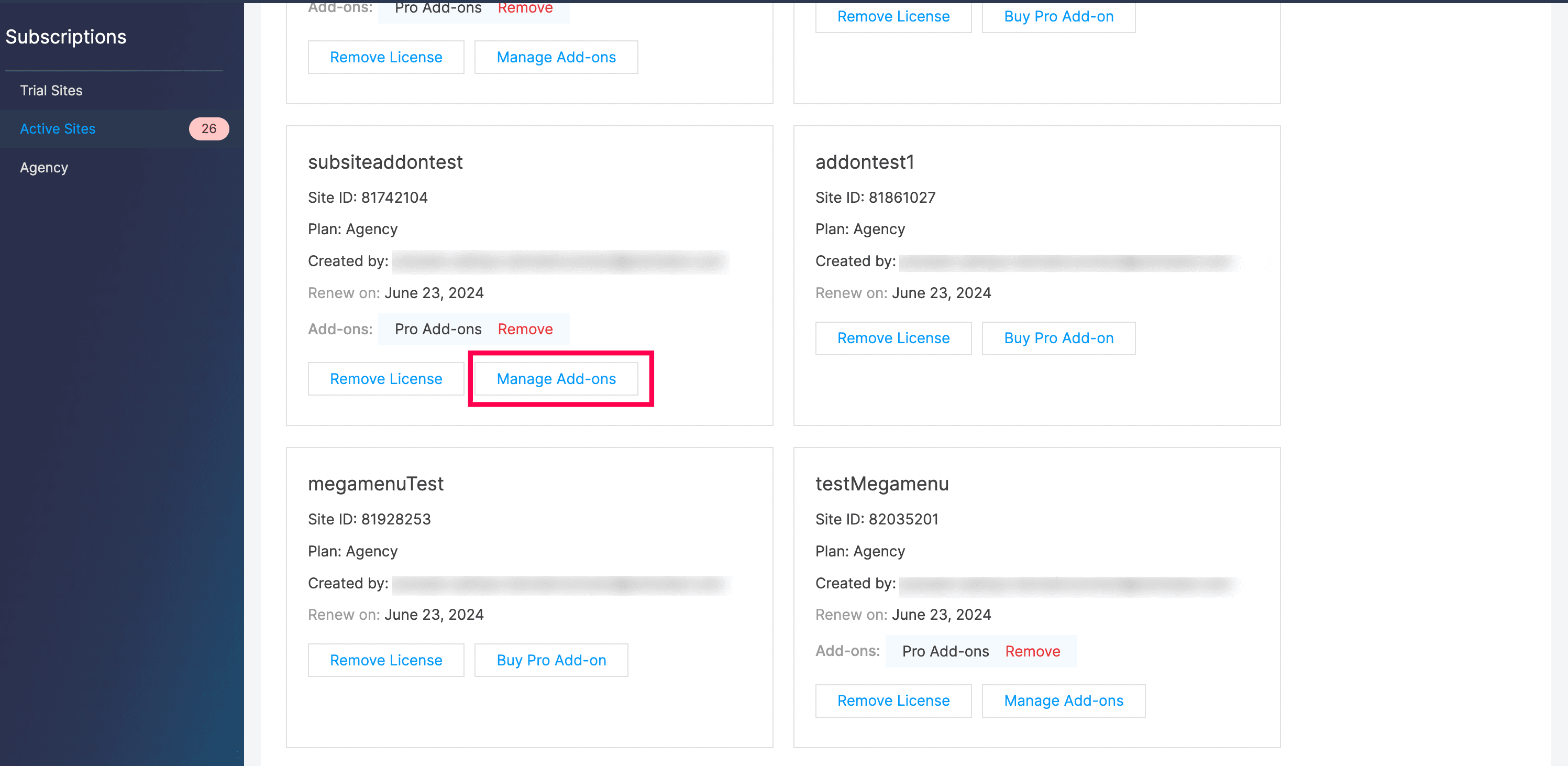 6. Once added, you can view the applied add-ons for each site. To purchase add-ons for more sites, click Manage License under the Agency tab on the subscriptions page.