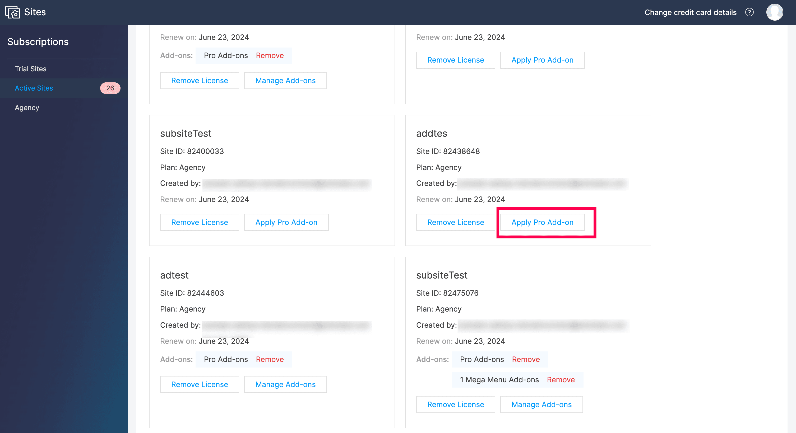 3. Choose the website you want to add additional add-ons to, then click Apply Pro Add-on. Once the Pro Add-on is added, you can add and manage other add-ons for that website.