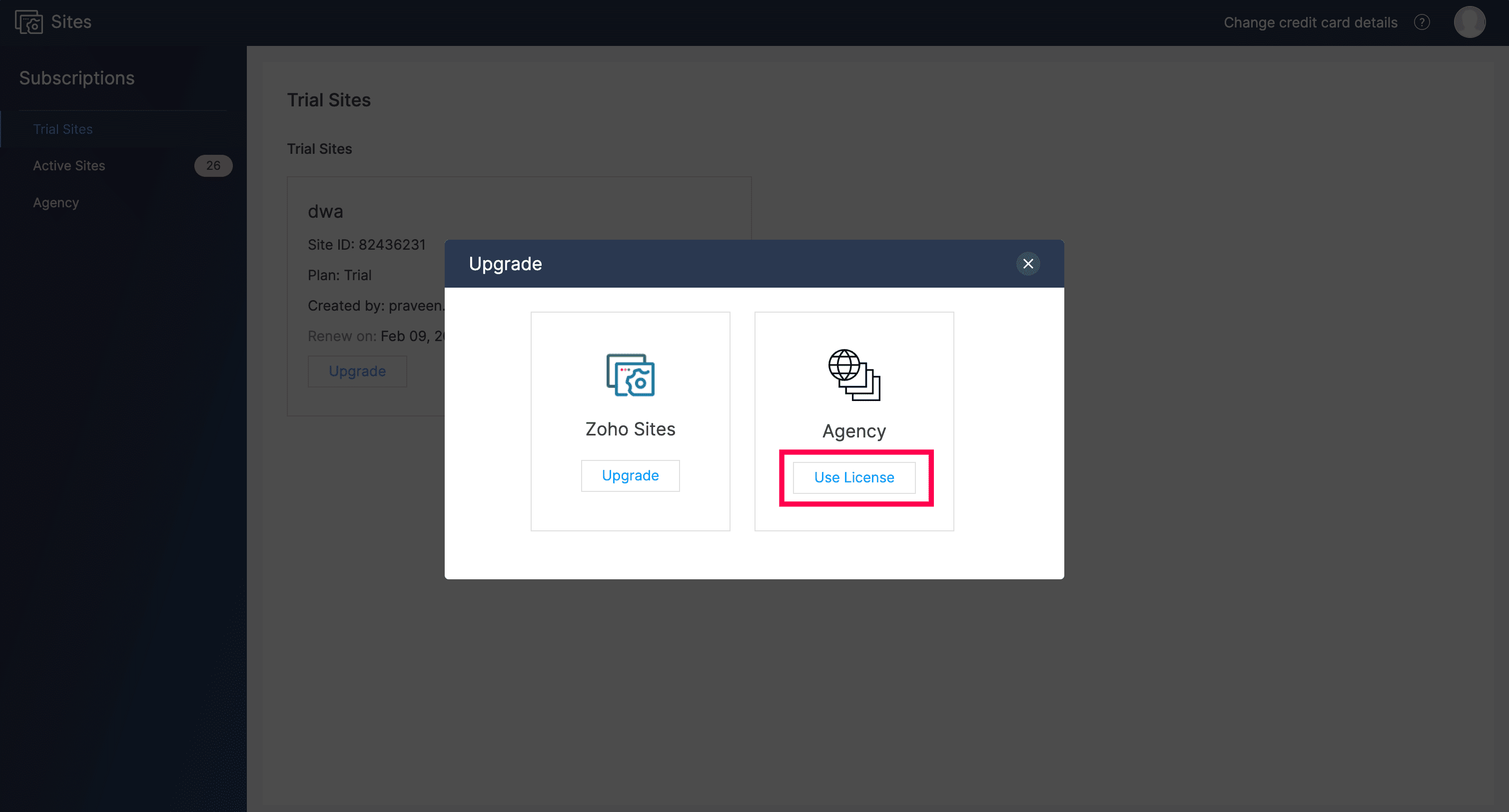8. If you want to downgrade or upgrade the Agency plan, click Manage License under the Agency tab on the subscriptions page.