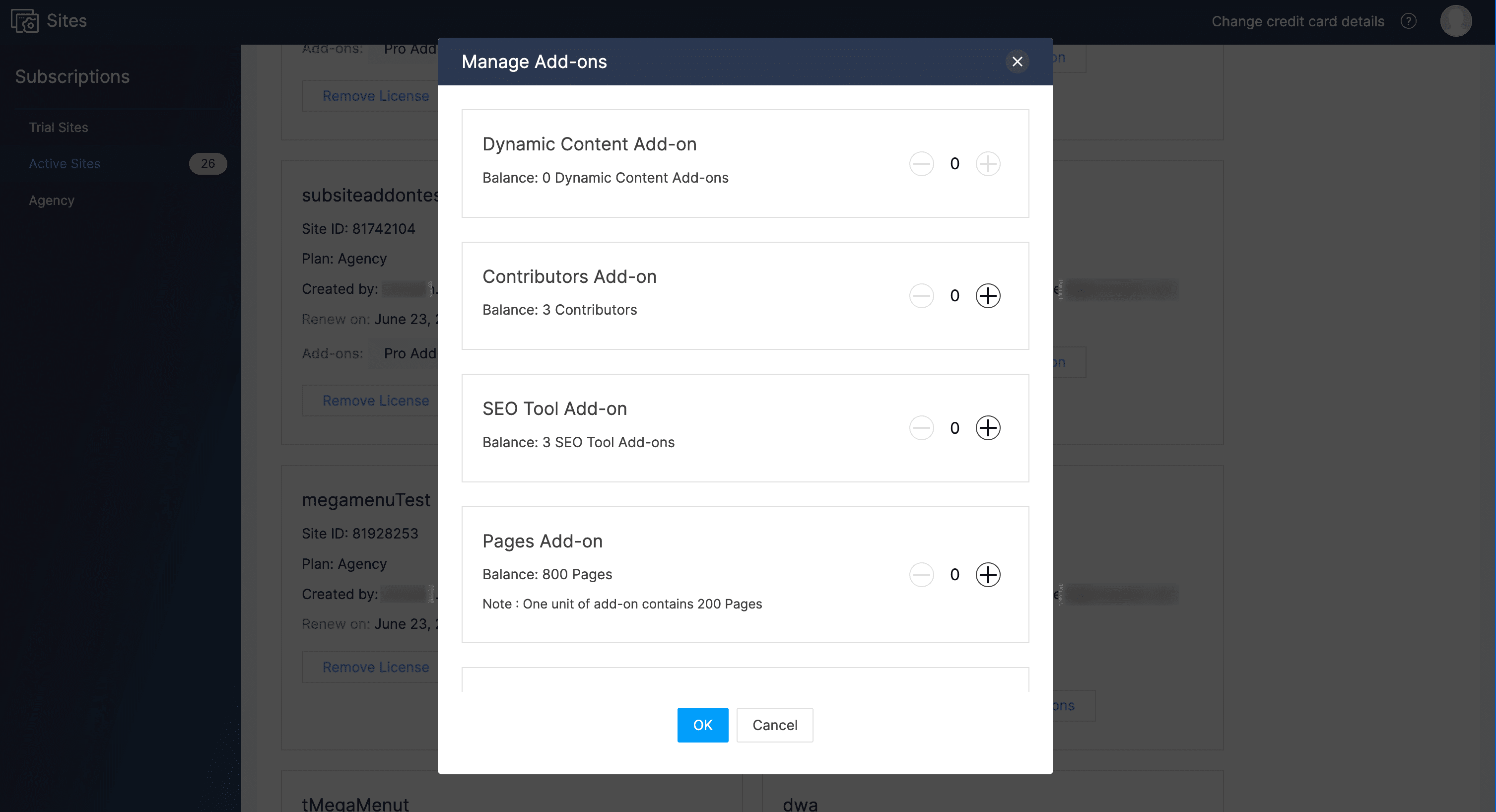 5. Manage the add-ons by clicking the + icon, then click Save when you're finished. The available cap will be displayed, which can be applied to individual sites. For example, if you have purchased an 800-page (4 counts) add-on, you can apply 200 pages (1 count) to four different sites with the Pro Add-on, or allocate 200 pages (1 count) to a site and distribute the remaining 600 pages (3 counts) to another site with the Pro Add-on.