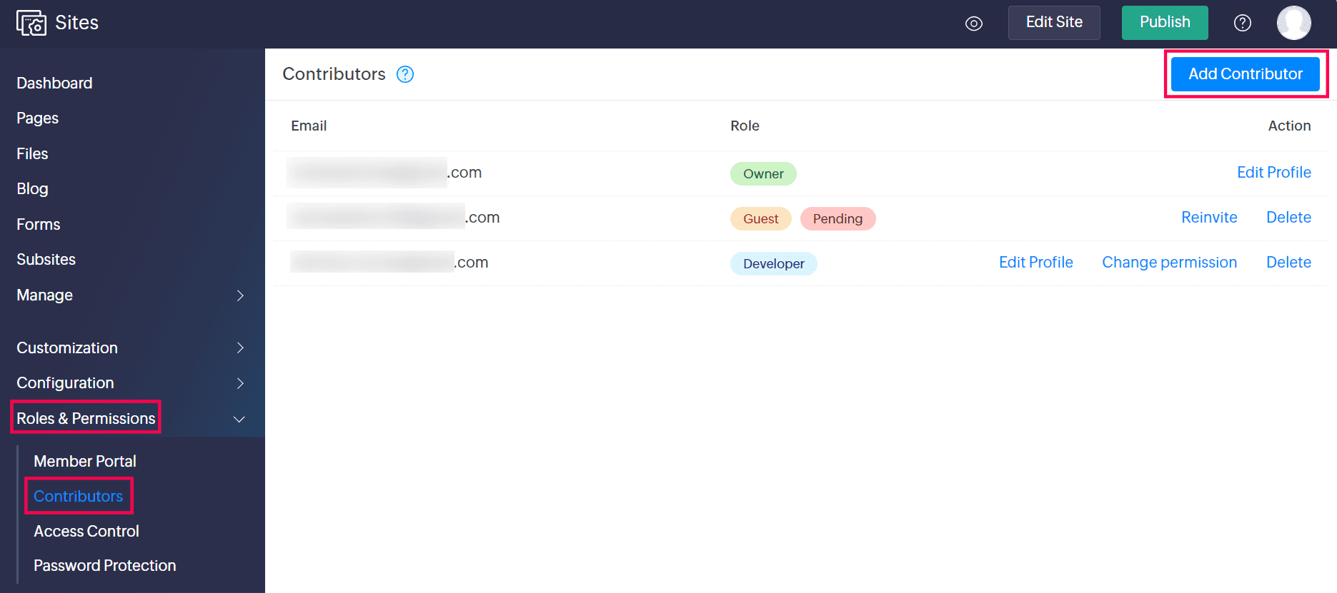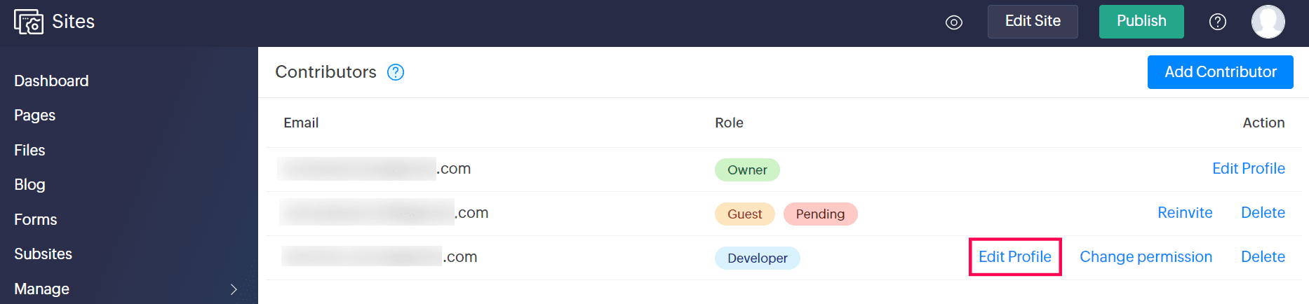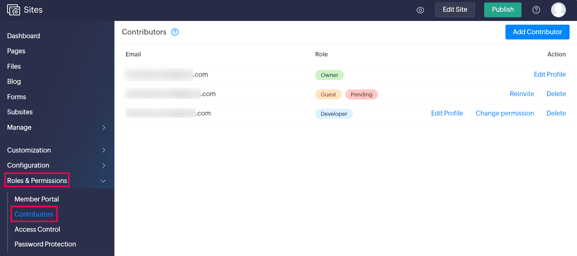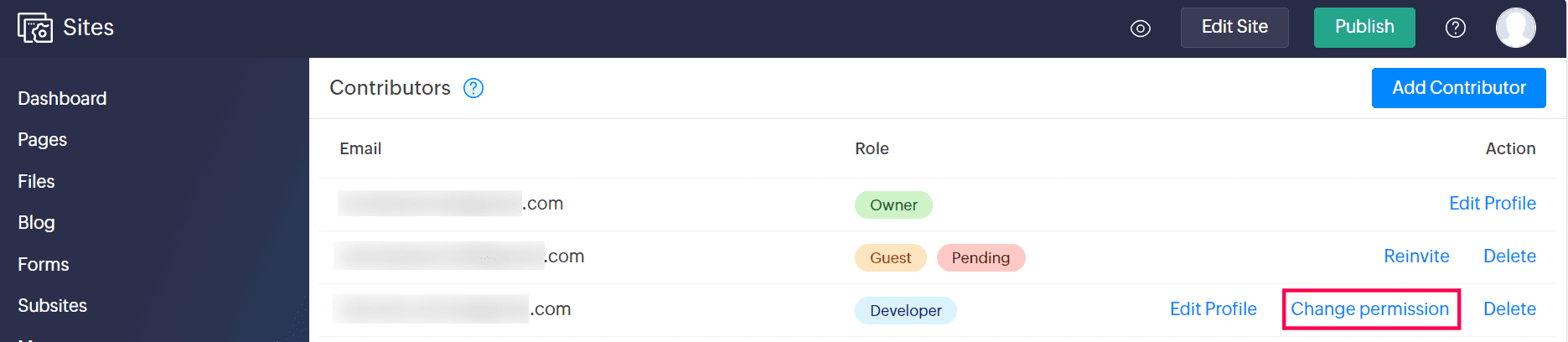 You can manage contributors by upgrading or downgrading their access and permissions. You can even delete contributors if they have completed their tasks with your website.