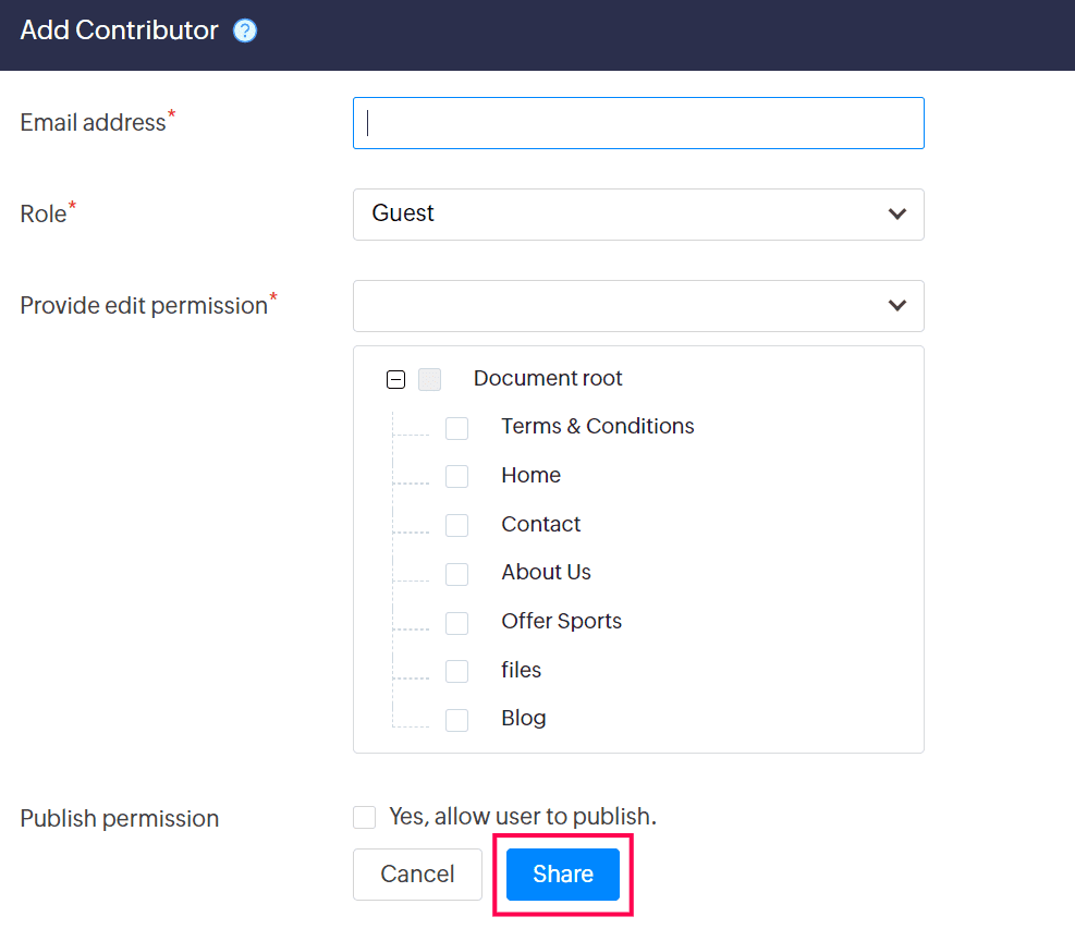 A website can have many collaborators working on its content. These collaborators can be added as contributors. They could be employees, partners, friends, family, or any individual who helps design your website. Subject matter experts who wish to contribute articles to your website can also be invited and given Author access.