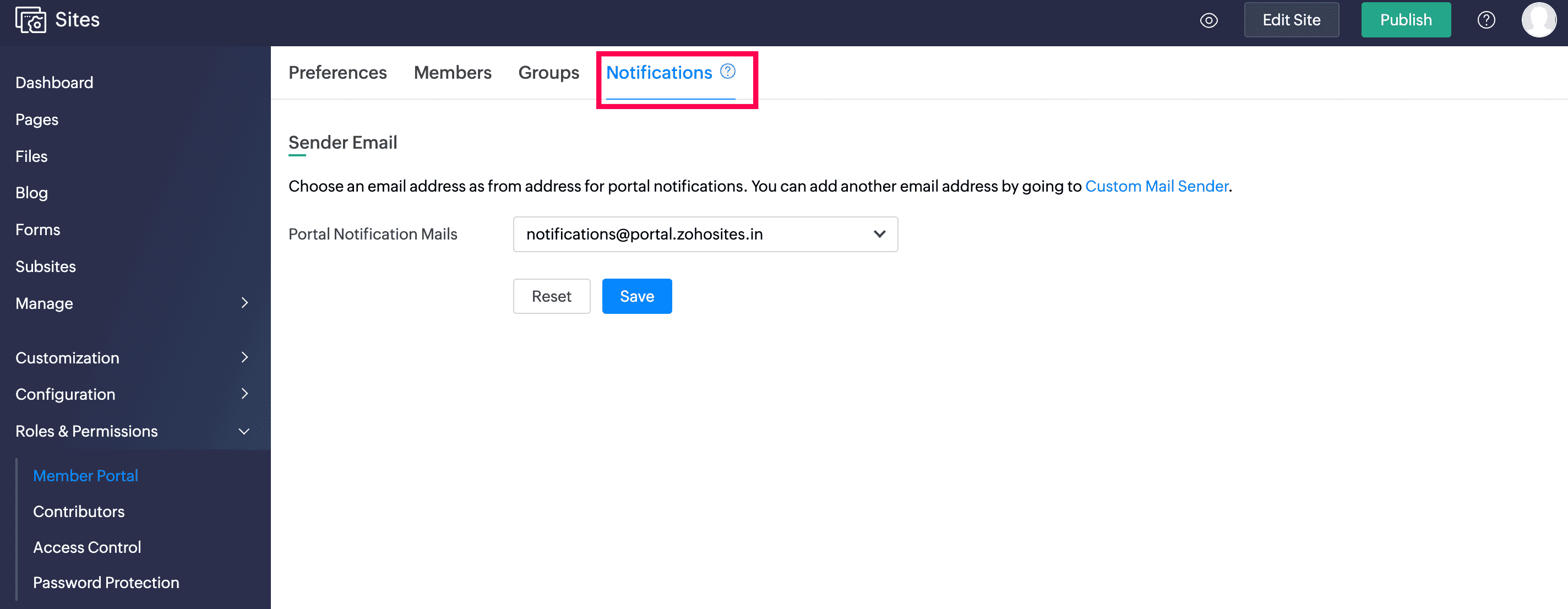 You can choose an email address as the From address for portal notifications. By default, notifications are sent from notifications@portal.zohosites.com. You can also add your custom mail addresses in custom mail sender.
