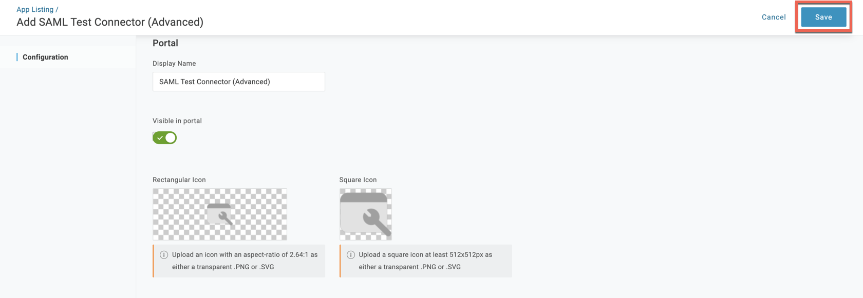 5. Provide a Display Name, enable Visible in portal toggle, and add a logo.