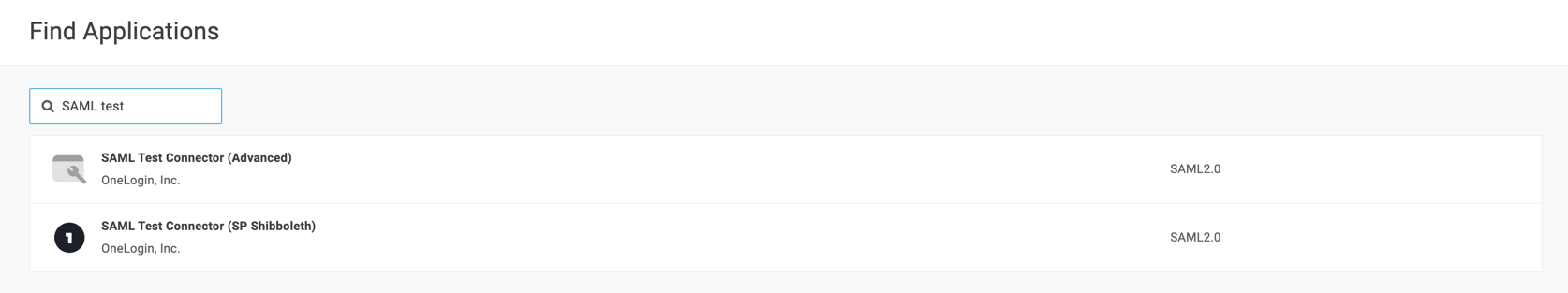 4. Search for SAML Test Connector and select the first result. Make sure that it is (IdP).