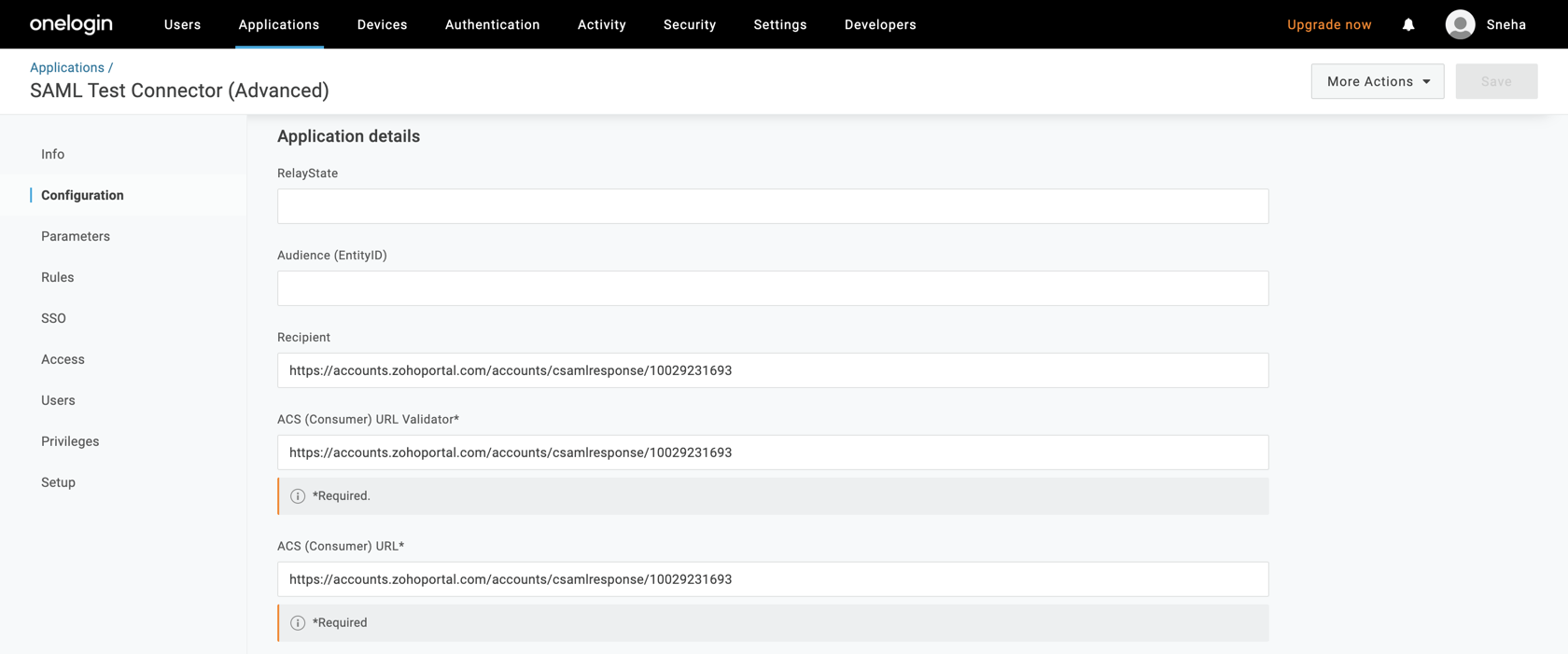 1. Paste the value of  ACS URL copied from Zoho Sites screen for the fields Recipient, ACS (Consumer) URL Validator, and ACS (Consumer) URL.