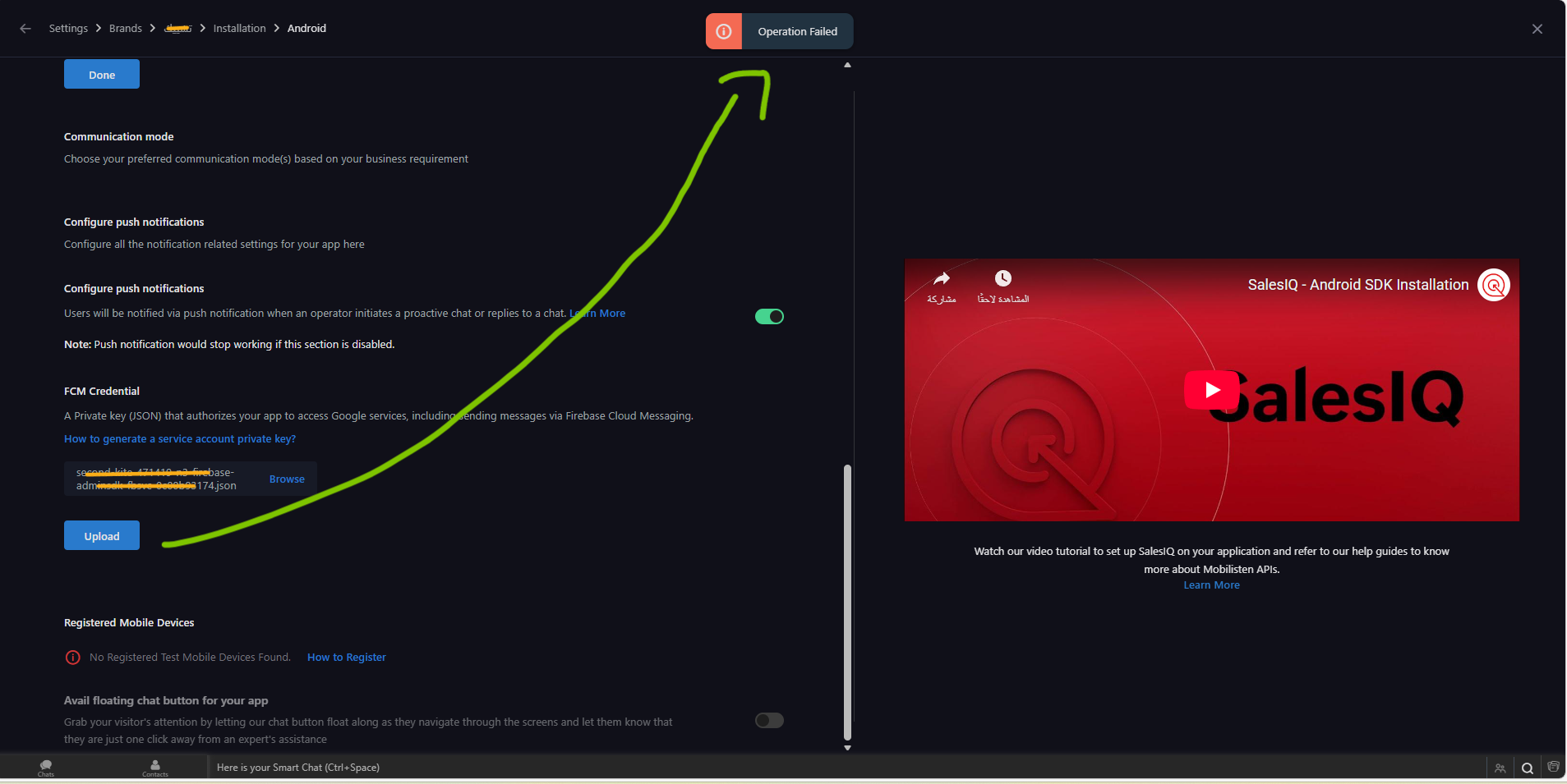 When I go to the Push Notifications Configuration section of the SalesIQ dashboard and try to upload an FCM credential file, a server error appears.