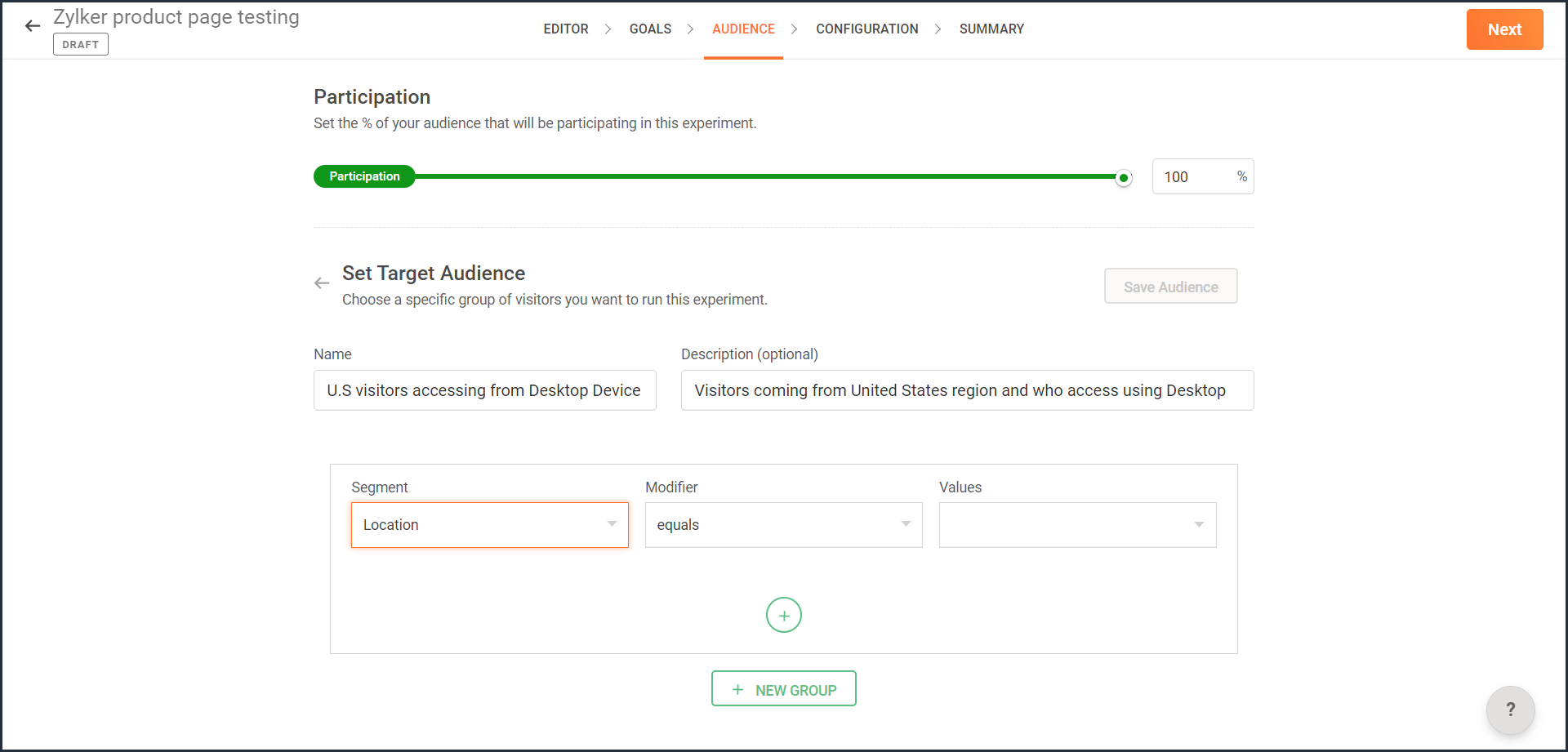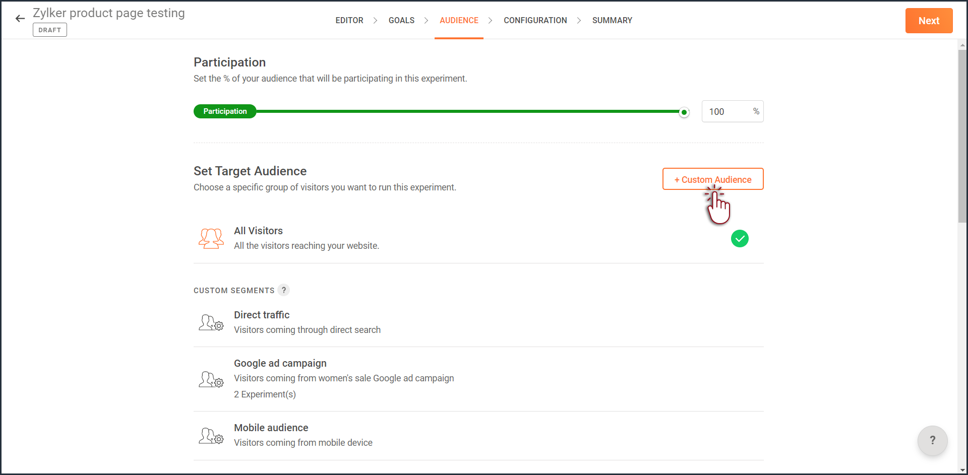 A custom audience in PageSense is a more refined approach of audience targeting. This feature lets you target and run your experiment to more precise subgroups or subsets of audiences based on visitor parameters like their geography, age, gender, browser used, purchase behavior, language, or industry type, which cannot be done using the
