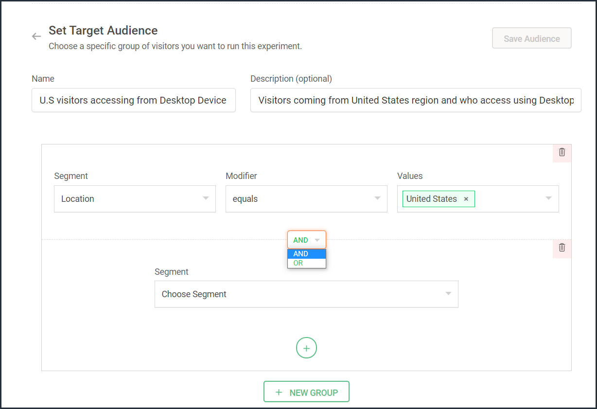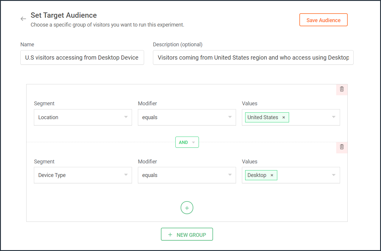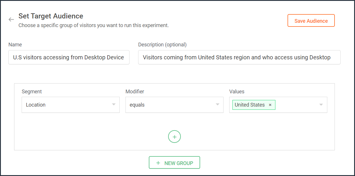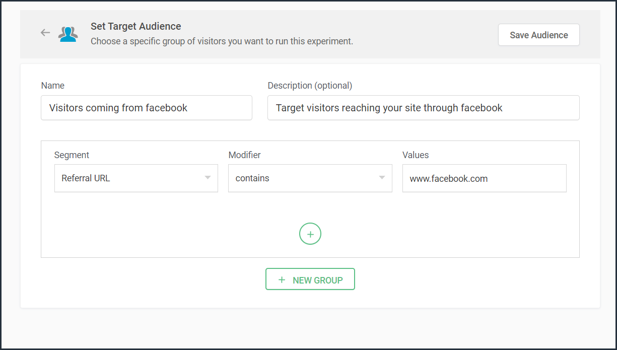 For example, say you own an ecommerce site, and you want your experiment to only target visitors referred by 'facebook.com'. In this case, you can create a custom audience segment to target visitors from this specific