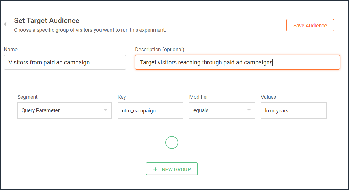 For example, say you own an online car dealership website and you want to redirect customers who click on a paid ad campaign with the utm_campaign=luxurycars to a landing page displaying luxury vehicles with prices and offers. For this, you can create a custom audience segment that explicitly targets your landing pages to visitors who contain this particular query string as shown in the screenshot below.