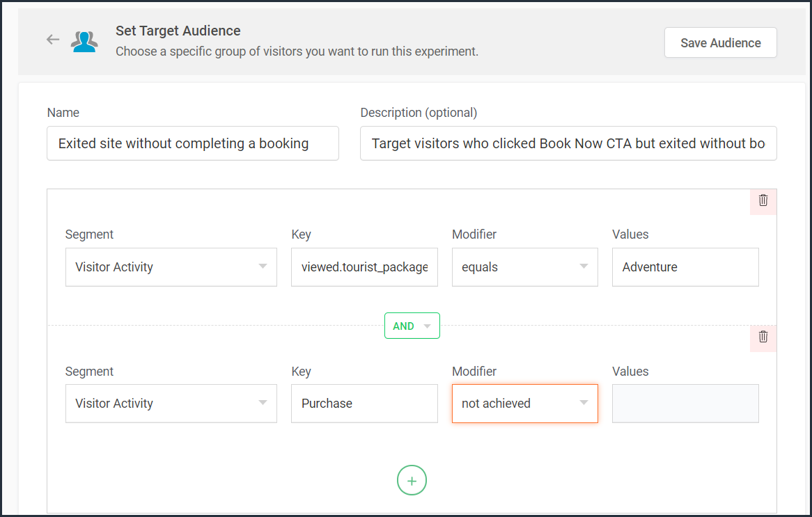 Adventure tourism package but exited your web page without completing a booking. In this case, you can create a custom audience segment to target your experiment for these segments of visitor interest and behavior as shown in the screenshot below.