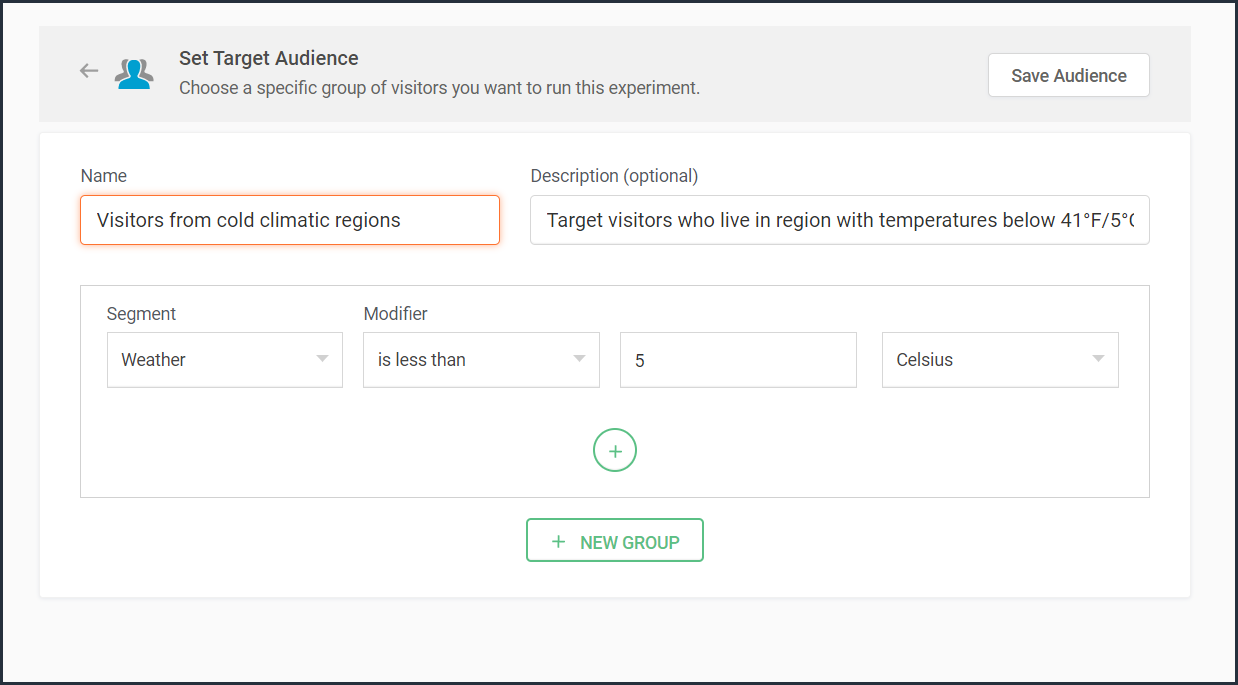 Targeting your experiment based on the local weather of the visitors coming to your website is another modern technique used by marketers to craft influential website content, product pages, and ad campaigns. Weather-based audience targeting allows businesses to anticipate patterns of demand and tap into the needs and purchase intentions of customers during different seasons of the year. It's also a great way to gain a competitive advantage and increase the average value of orders and conversions on a website.