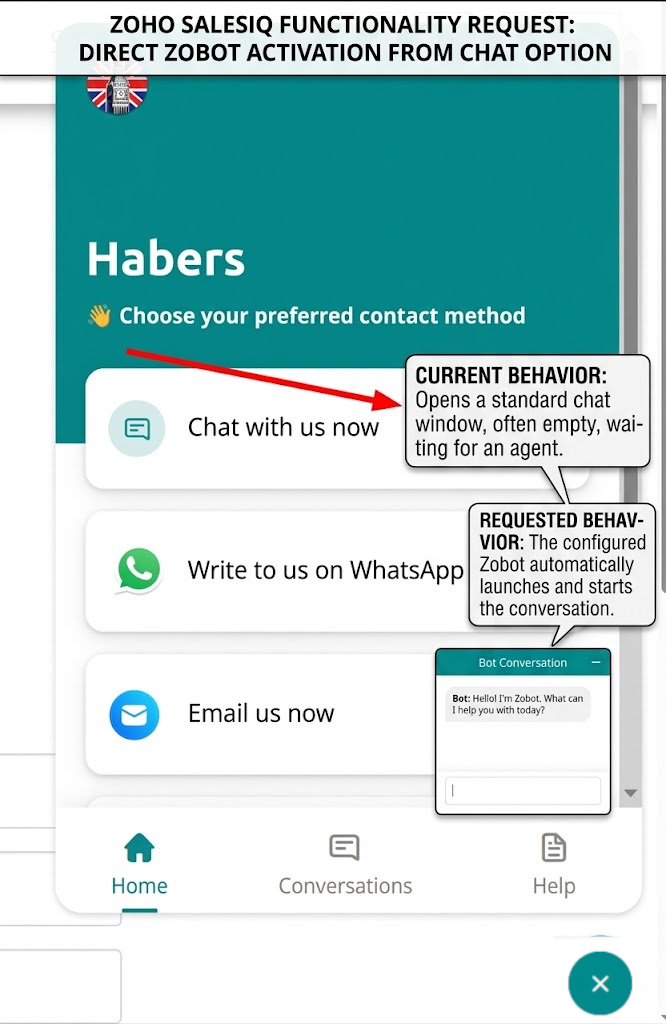 We would like to have the ability to configure SalesIQ so that the Zobot launches automatically and starts the conversation as soon as the user clicks the 'Chat with us' button. This would help us engage with users instantly, without waiting for their initial input.