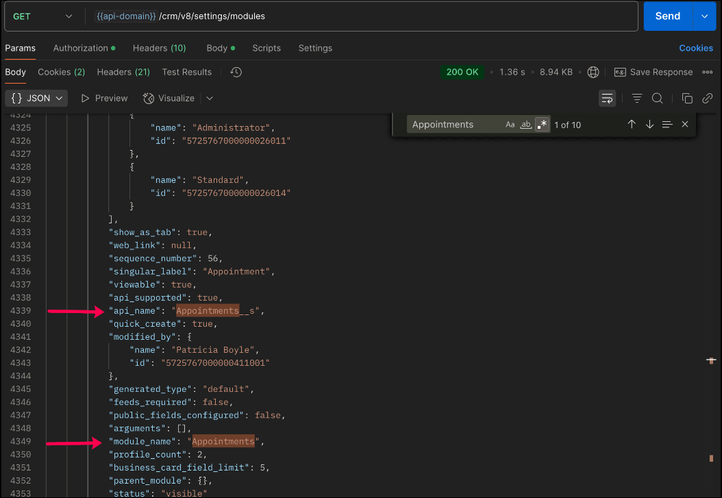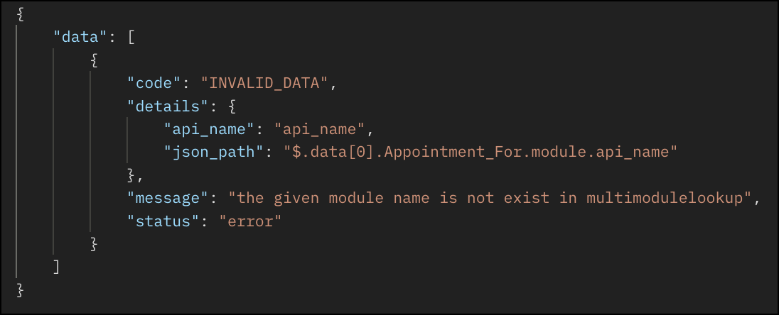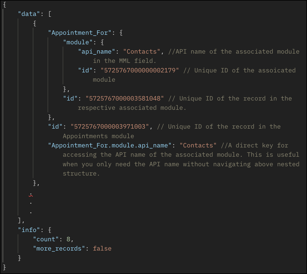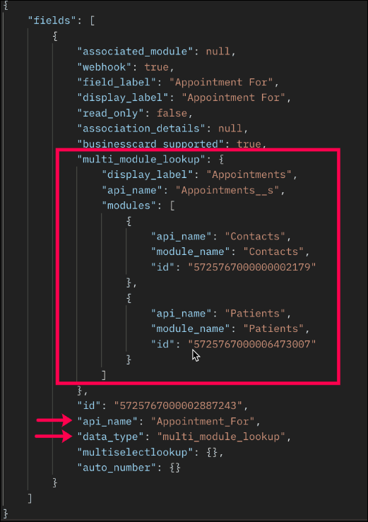 "multi_module_lookup": { "display_label": "Appointments", // Display label of the module where the MML field is used "api_name": "Appointments__s", // API name of the Appointments module "modules": [ //List of modules associated with the Appointments module. { "api_name": "Contacts", //API name of the associated module "module_name": "Contacts", // Display Name of the module "id": "5725767000000002179" //Unique ID of the module }, { "api_name": "Patients", //API name of the associated custom module "module_name": "Patients", //Display label of the module "id": "5725767000006473007" //Unique module ID } } ] }, |